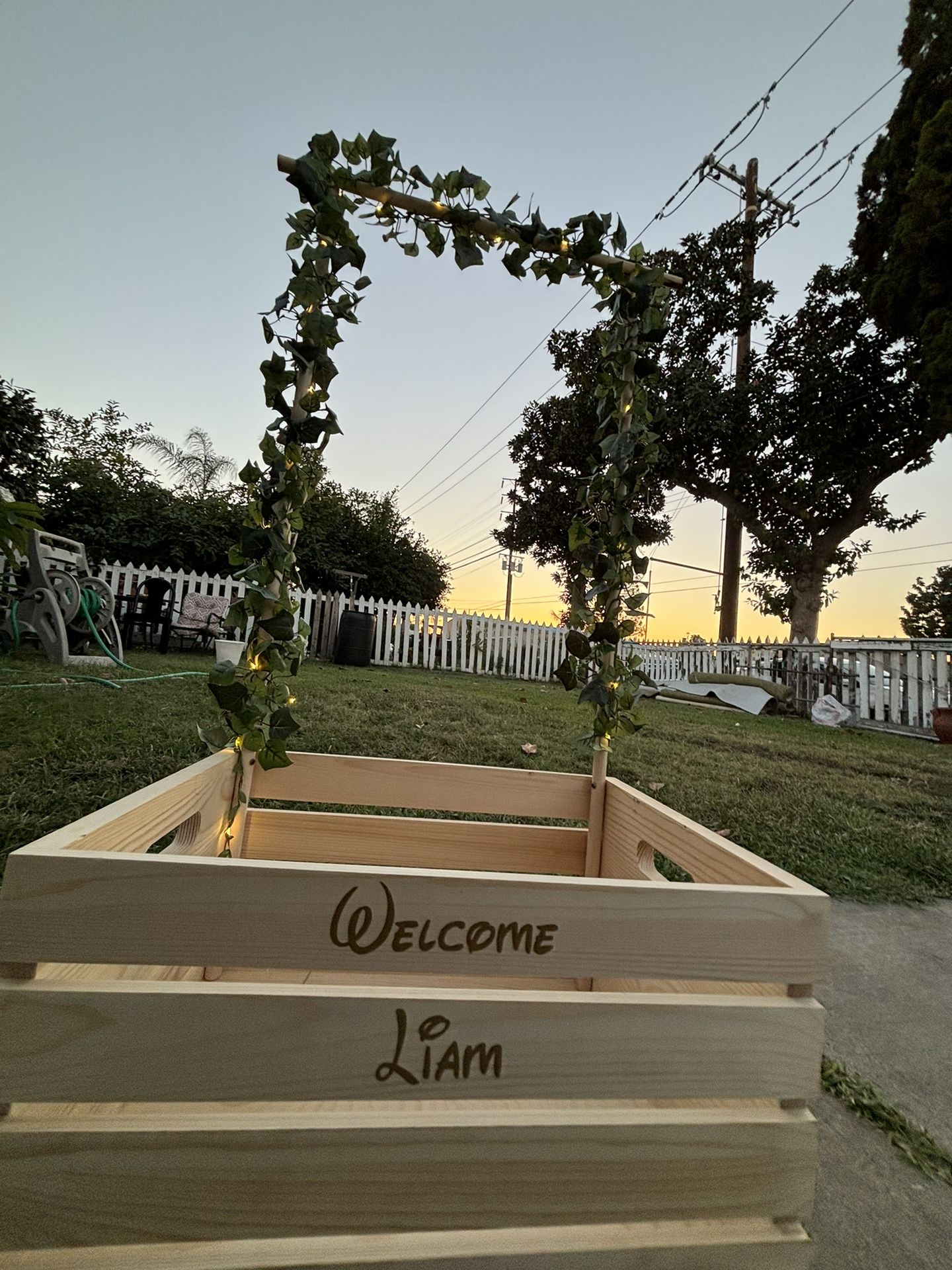 Must be ordered a week before. These are created as requested. No clothing or items included unless requested. Additional fees of clothing will apply. Color of crate: -natural wood -white Comes with leaves and lights Along with “Welcome baby” or “Welcome name(of baby)”