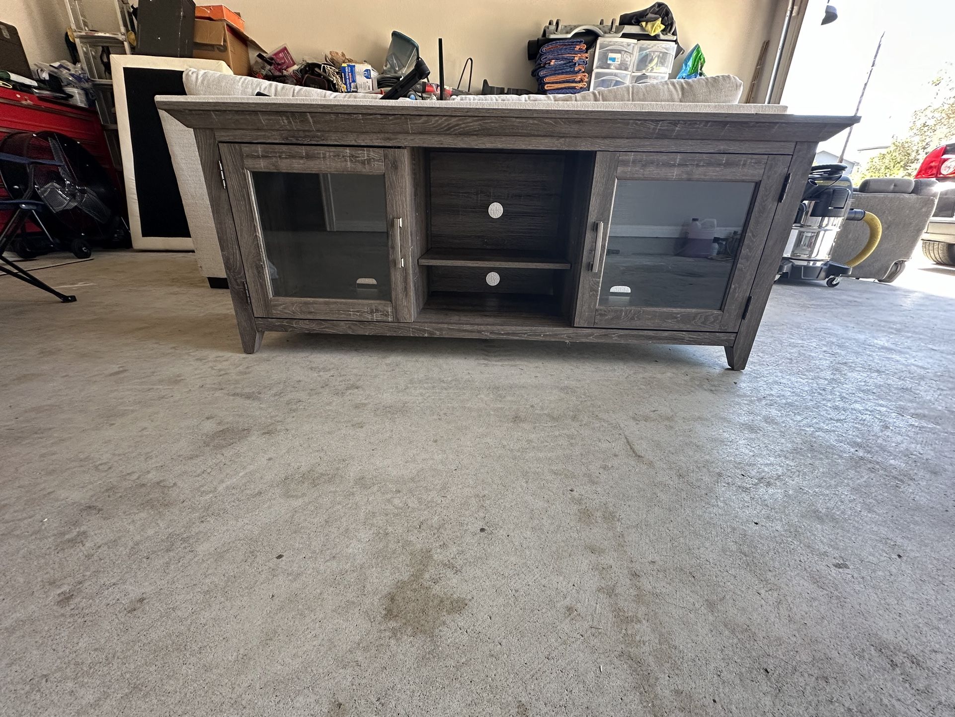 Wooden Tv stand with two side cabinet space and middle compartment. Used inly a couple months! Pick up only!