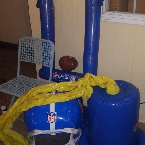 Inflatable balloons and cardboard standees plus Cup & Beer bottle from Super Bowl 50 in 2016. (Denver Broncos won over Carolina in Peyton Manning's final game). The yellow goal posts will need some a way to seal the top to keep them inflated. They have 2 pre-cut holes for something that must've gone on them.