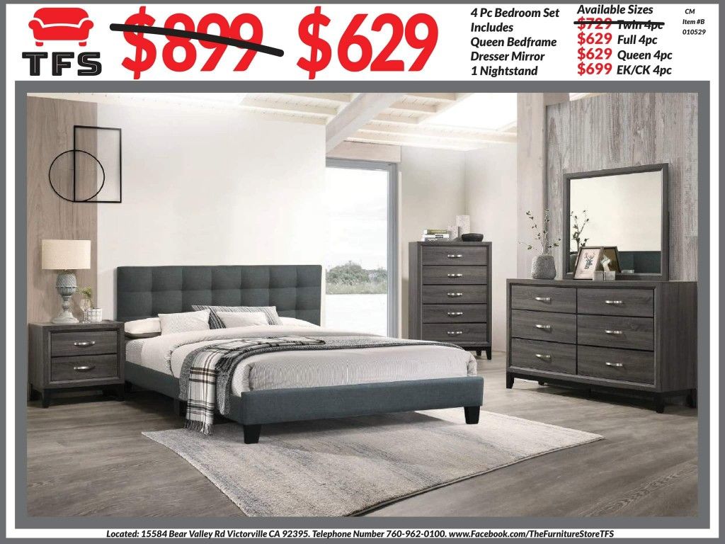 4pc Bedroom Set Full $629 4pc Includes Upholstered Fabric Bedframe Dresser mirror nightstand Grey Bedroom Set Queen $629 4pc Includes Upholstered Fabric Bedframe Dresser mirror nightstand Gray Bedroom Set Eastern King/California King $699 4pc Includes Upholstered Fabric Bedframe Dresser mirror nightstand Gray Bedroom Set VISIT US TODAY THE FURNITURE STORE 15584 BEAR VALLEY RD VICTORVILLE CA 92395 OPEN 7 DAYS A WEEK 10AM-6PM FINANCING AVAILABLE NO CREDIT NEEDED 90 DAYS OR 100 DAYS 0% INTEREST DELIVERY AVAILABLE IF NEEDED RESTRICTIONS APPLY: Prices are Subjected To Change Without Notice