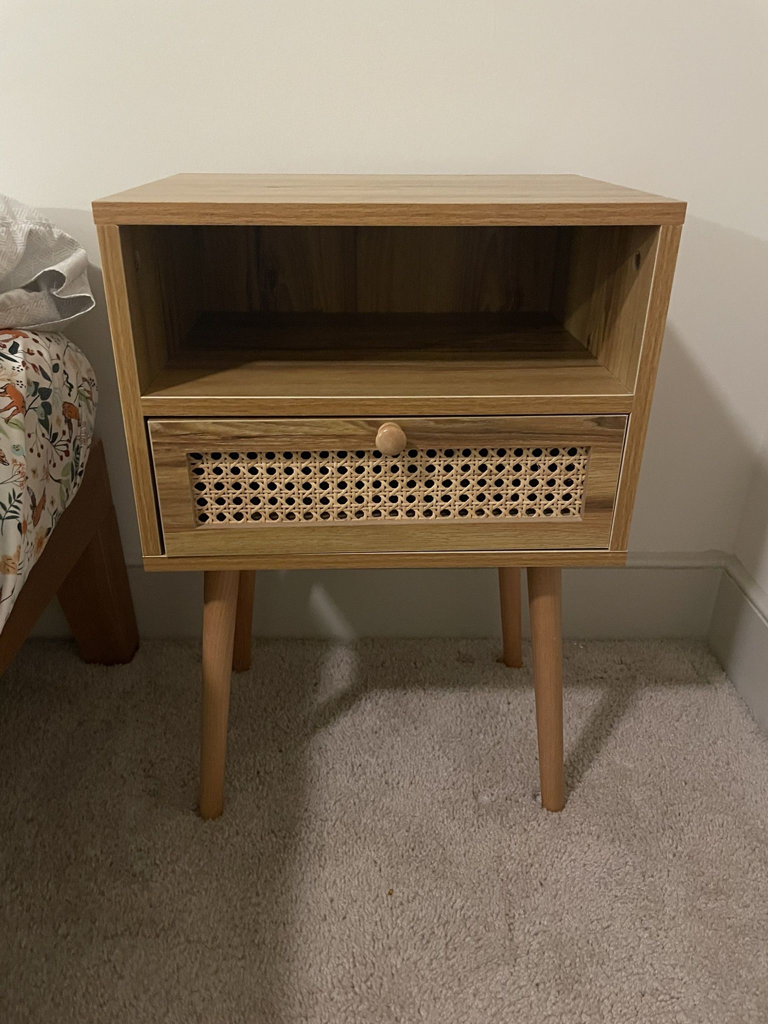 Beautiful rattan nightstand with a solid wood frame and legs, perfect for any bedroom or living room. Used for about a year but still in excellent condition — sturdy, clean, and looks almost new! ✅ Drawer + open shelf for storage ✅ Stylish modern + boho look ✅ No major scratches or damage Color: Natural wood Dimensions: Approx. 16”W × 14”D × 22”H Smoke-free, pet-free home. Pickup only.