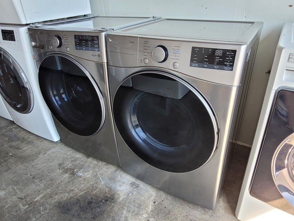 NEW LG ThinQ Front Loading Washer And NEW LG Stackable Gas Dryer Set In Graphite Steel Stainless Steel