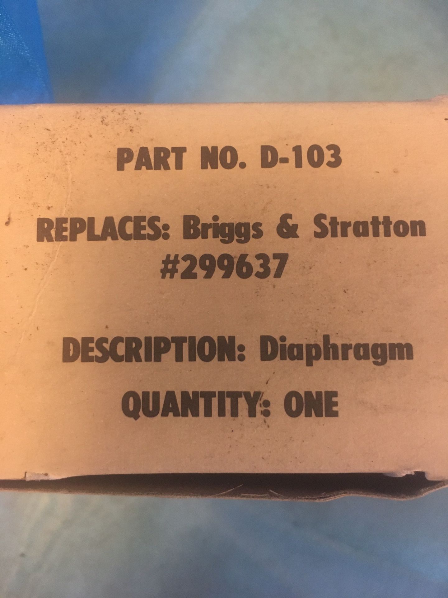 Carburetor Diaphragm: Replaces Briggs & Stratton #299637. Condition is New. Shipped with USPS First Class Package. Old stock, new part. Part No. D-103 Box No. D-103BXZ