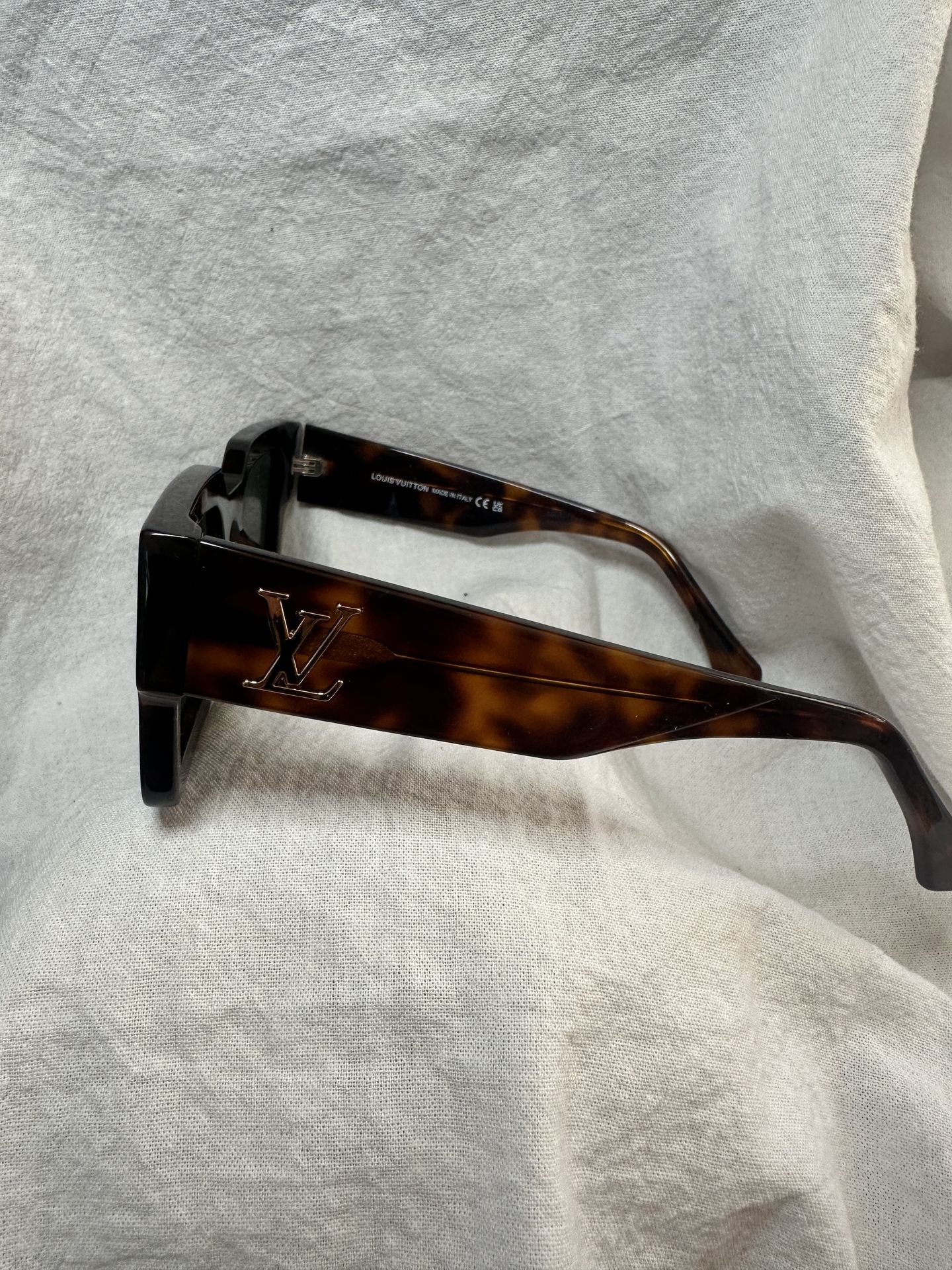 LV Clash Square sunglasses with tortoise hue frames and green lenses. Square shape Tortoise Acetate frame Green lenses Signature hardware Made in Italy Transmittance:11% UV Protection:100% Filter Category:3