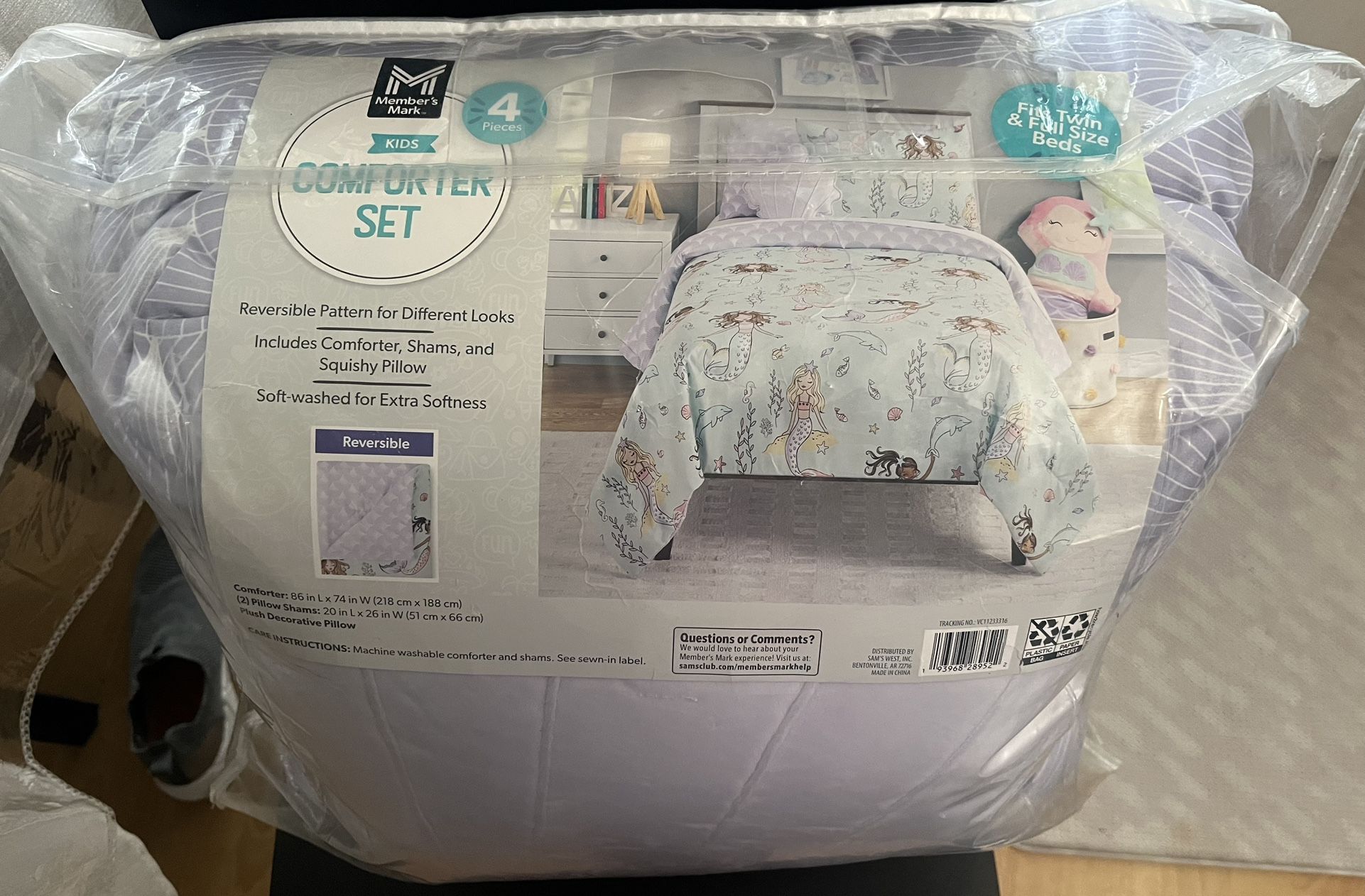 Comforter/ 2 Pillow Shams/ 1 Plush Decorative Shell Pillow. The Comforter has reversible patterns: one side is Mermaids and the other side are Shells. It fits Twin and Full size beds