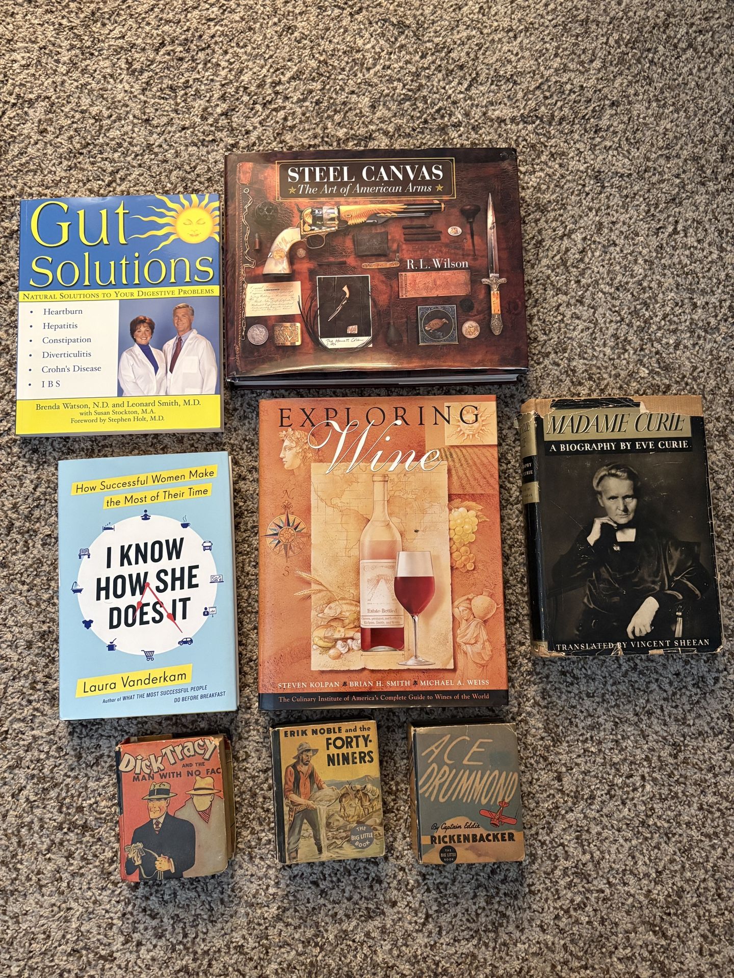 Clearing out space and selling this mixed book bundle. All books are in very good condition with clean pages and solid bindings. Bundle includes: • Steel Canvas: The Art of American Arms (R.L. Wilson – large hardcover) • Exploring Wine (The Culinary Institute of America – large hardcover) • Madame Curie biography • Gut Solutions • I Know How She Does It • 3 vintage small-format books: • Dick Tracy: The Man With No Face • Erik Noble and the Forty-Niners • Ace Drummond Perfect for collectors, décor, or resellers. Take them all together—no separating.