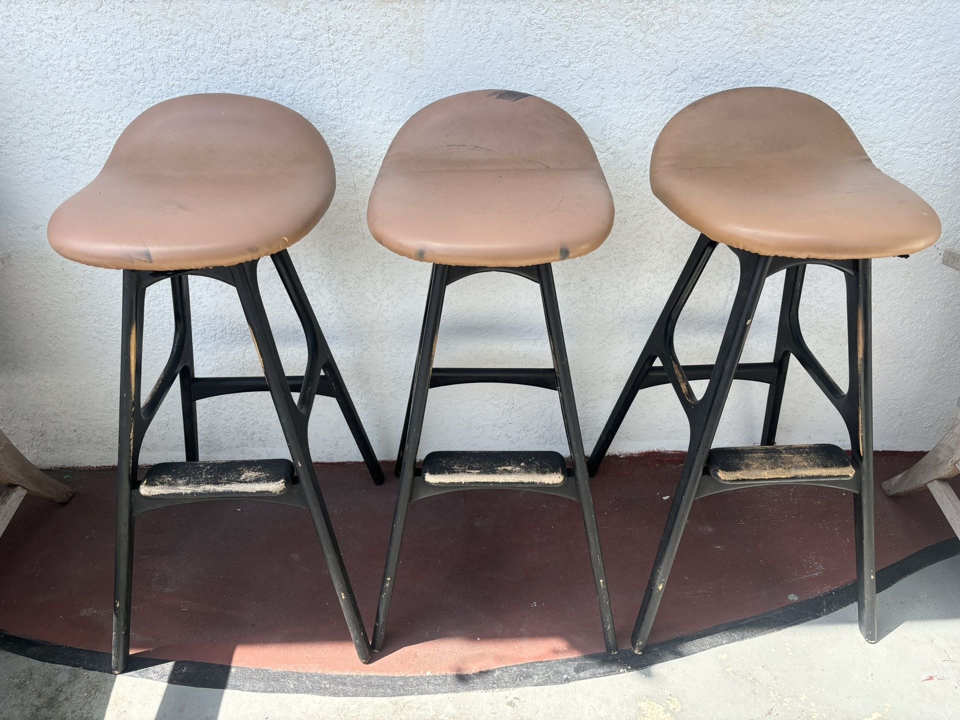 these stools are really in great shape. They just need a little TLC. There are no tears in the fabric and the bases have no wood chipping -a little paint and they can be really nice.