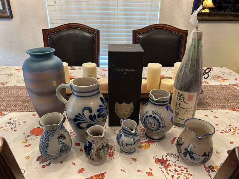 Selling German pottery from an estate sale. Also a vase from Japan. Everything in the picture is also for sale (age restricted). Candles are sold.