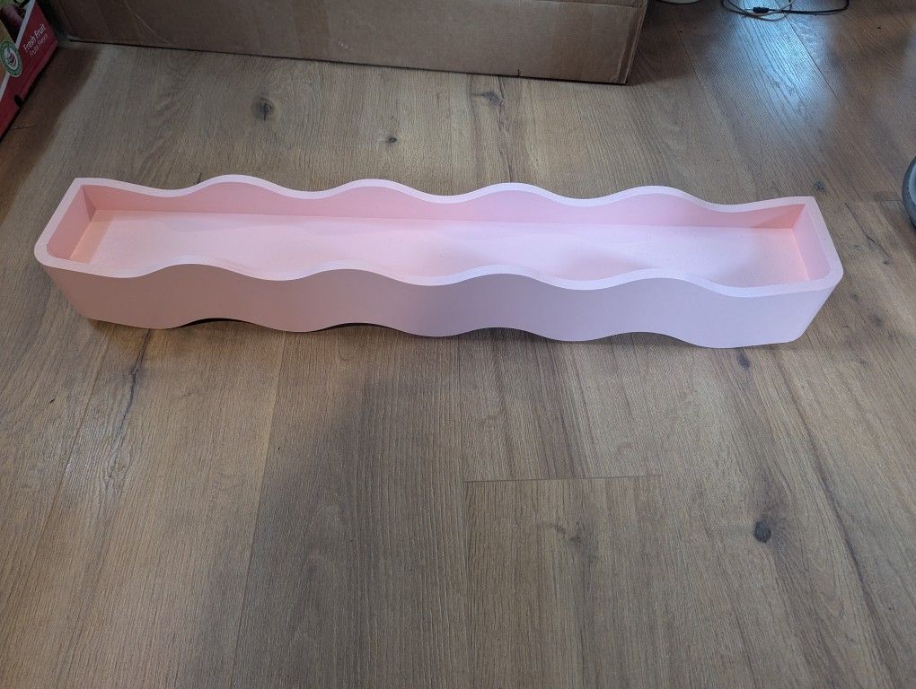 New, never used or mounted. Two shelves available. 3D Floaty Squiggle Shelves. Pink Shelf: Interior L 31 in x W 4.5 in x D 1.5 in. Exterior L 32 in x H 3.5-4in x W 5.5 in. Comes with screws, drywall hangers, and 3 LED light strips to place on the underside of the shelf. They are motion sensor lights.