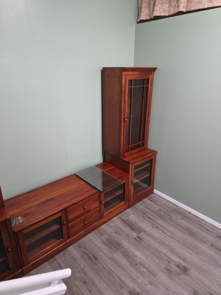 Screws included 6 pieces glass cabinets. Great for wine bottles or TV stand. We are selling our home and want to get rid of big furniture for low prices. Our loss is your gain. Pick up only.