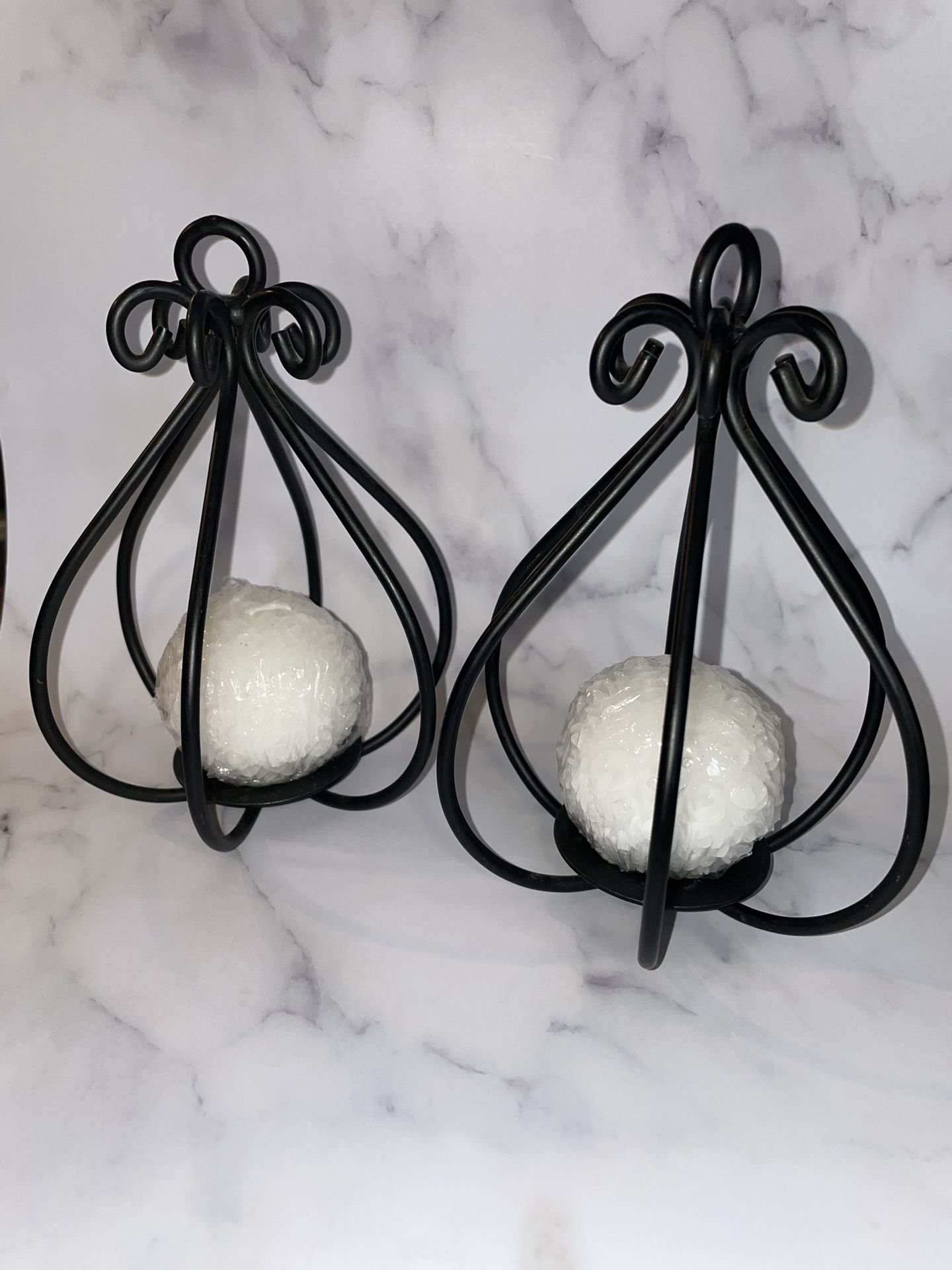 Enjoy this pair of indoor use candle holders. Selling as a pair with candles included. The holders can hang or sit on a shelf or counter top. Standing 7.5 inches tall and 5.5 inches wide. The white candles have roses detailed in them.