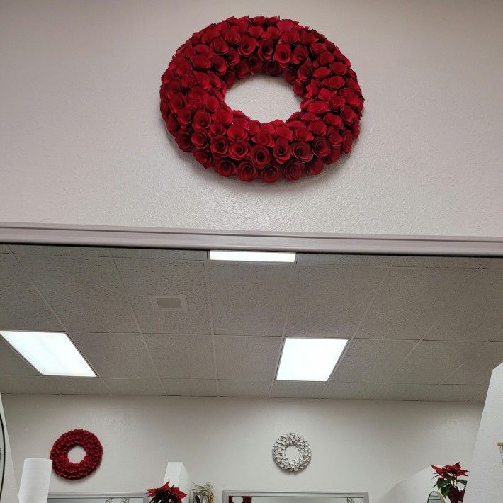Beautiful, red wood, shaving wreaths. Beautiful white wood, shaved wreaths, with white pine cones and glitter
