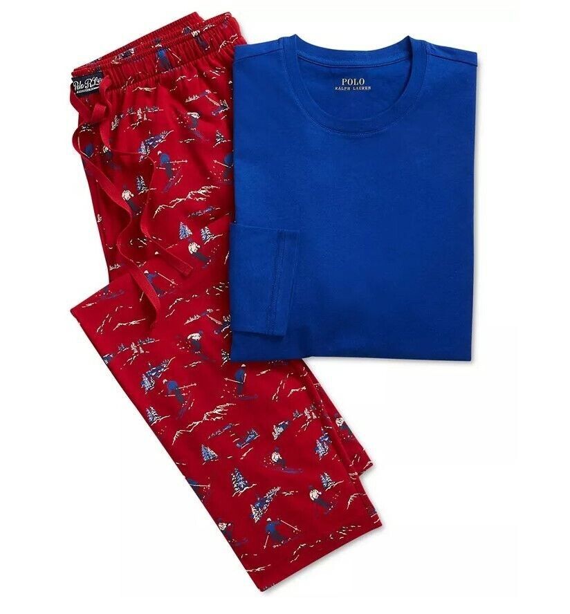 NEW WITH TAGS SIZE M /MED This comfortable cotton jersey sleep set comes with drawstring pants featuring an allover ski motif and a solid-hued long-sleeve shirt finished with Ralph Lauren's signature Pony. Approx. model height is 6'1" and he is wearing a size medium Shirt: crewneck; long sleeves; signature Pony embroidered at the hem Pants: elasticized drawstring waist with woven "Polo RL" label Shirt and pants: cotton COLOR BLUE RED MULTI RETAIL $75
