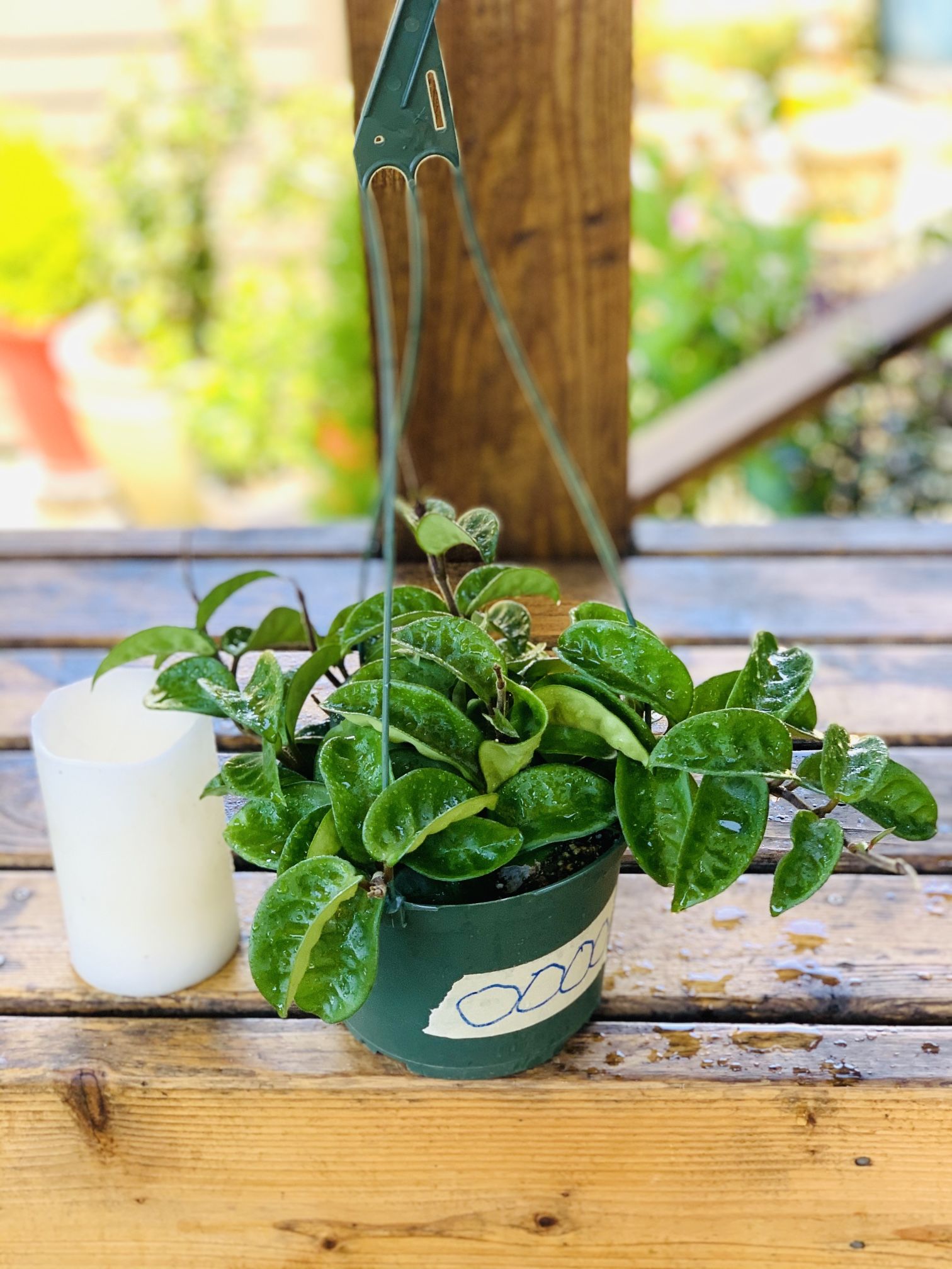 Live indoor Hoya Krinkle 8 plant in a hanging plastic planter pot—firm price