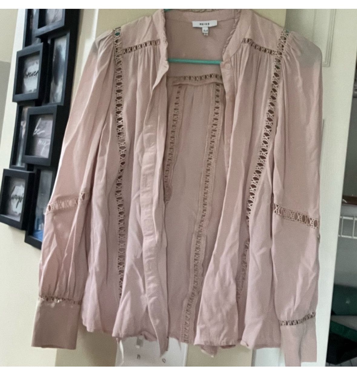 BEAUTIFUL Reiss blouse with extravagant detailing. Crafted with a lightweight fabric, it features elegant vertical detailing that adds a touch of sophistication. suitable for both casual and formal occasions.