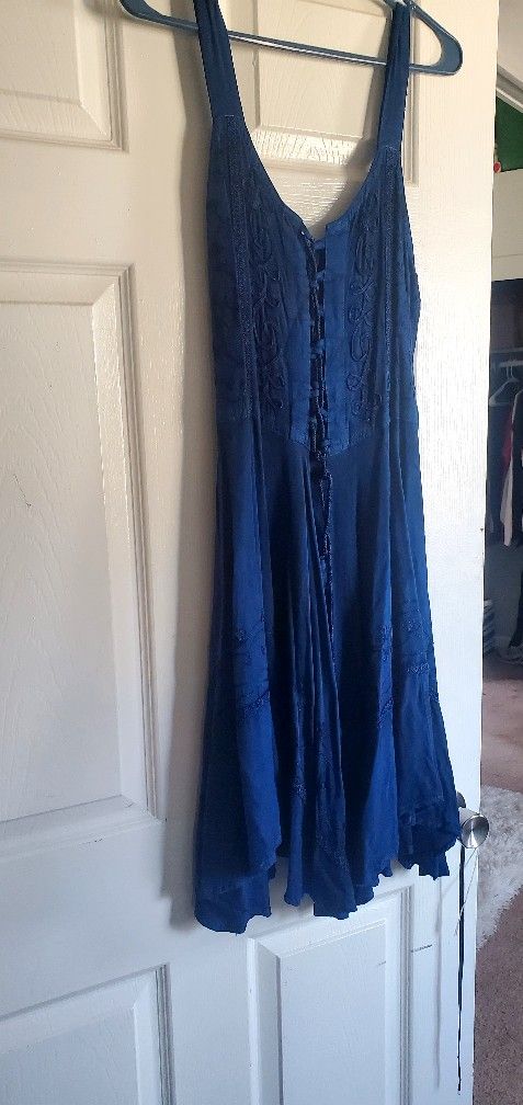 gorgeous color specially in the sun. Kind of renaissance lookin style. Verry flowy.Size med has tie in back to bring in waist. length from armpit is 28/29"