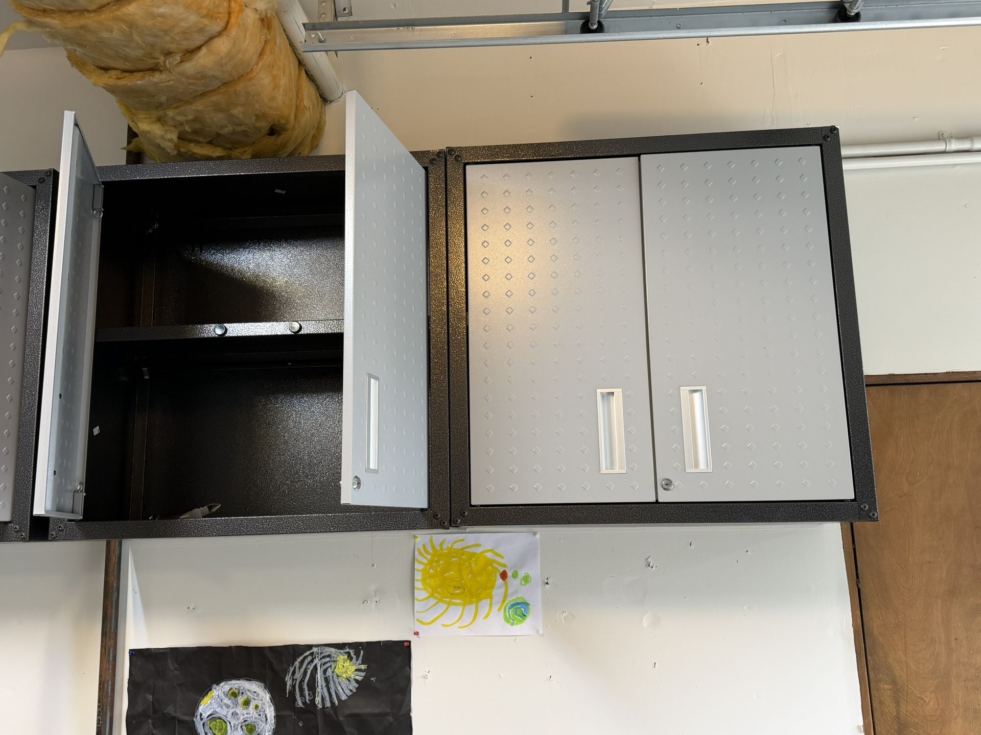 $50 each- Gladiator garage cabinets! Like new! All shelves included… 5- wall cabinets. 30” x 30” x 12” deep. 1- freestanding locker cabinet. 30” wide x 75” tall x 18” deep. $150 Gray doors and black shell, all powder coated and metal.