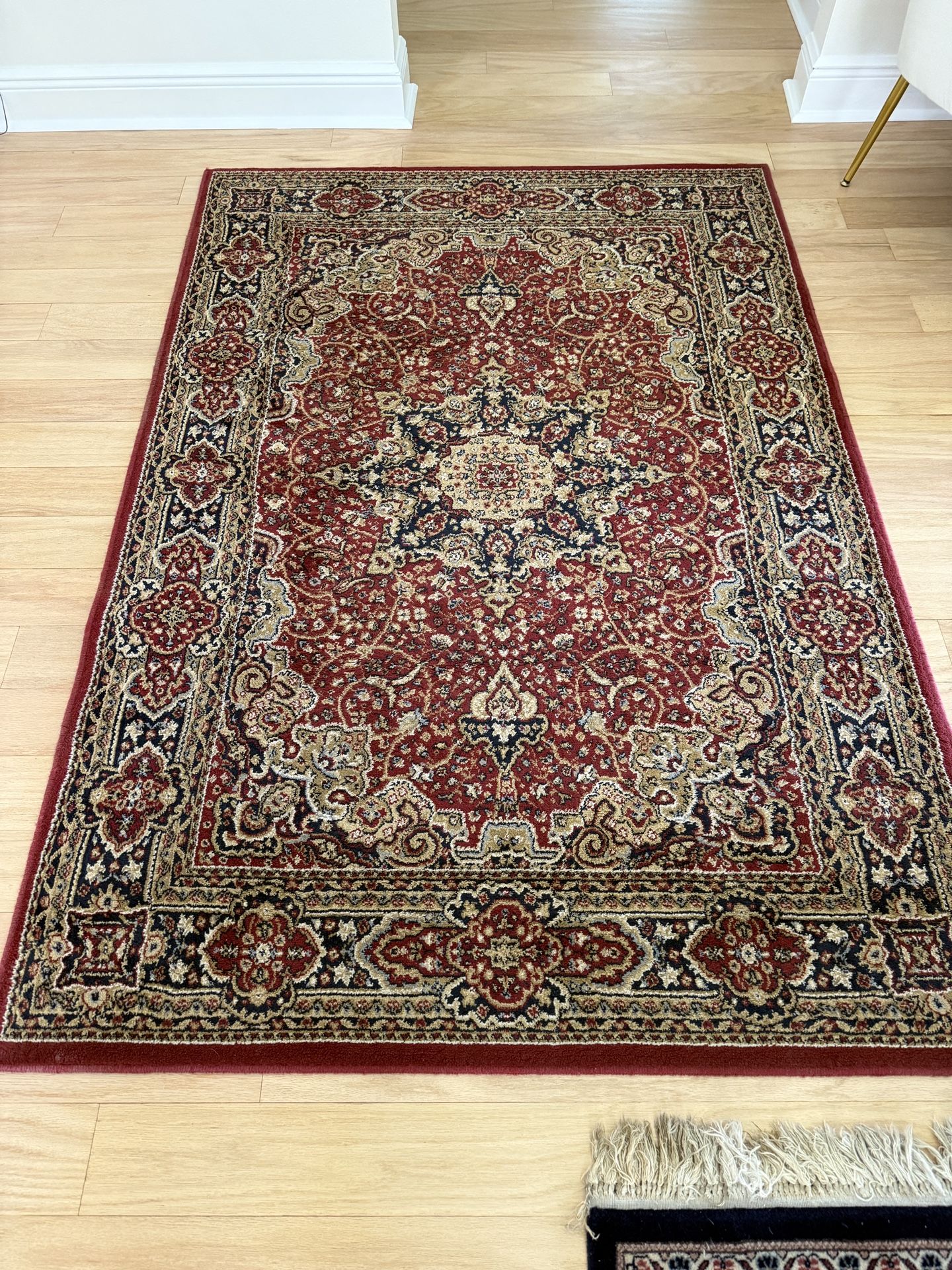 This is a traditional-style area rug featuring a rich red background with an ornate central medallion and intricate floral patterns in gold, navy blue, and ivory tones. The border is equally detailed, framing the central design with repeating motifs.