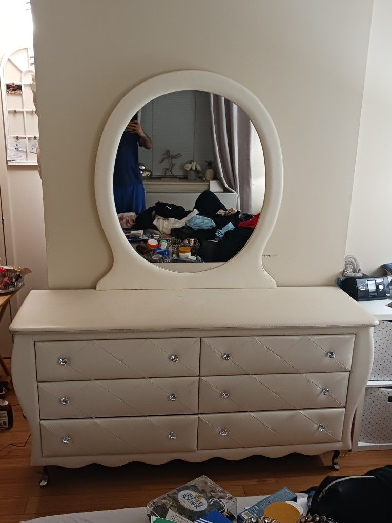 Cream-colored dresser with attached mirror and six drawers. Features diamond-pattern drawer fronts with diamond-style crystal handles. Solid and heavy piece. All drawers open and close properly. Mirror is intact with no cracks. There are visible stains and signs of use. The dresser needs cleaning and light restoration, but it is fully functional and in good structural condition. Details: Color: Cream Includes: Dresser with attached mirror Drawers: 6 Handles: Diamond-style crystal knobs Condition: Good shape with stains; needs cleaning/restoration Dimensions: Length: 61 ⅝” Width (Depth): 18 ⅛” Important Notes: Heavy item — assistance may be needed for moving Sold as-is No holds without deposit Delivery / Pickup: Local delivery only within the Bronx No shipping Delivery fee may apply depending on distance Pickup available