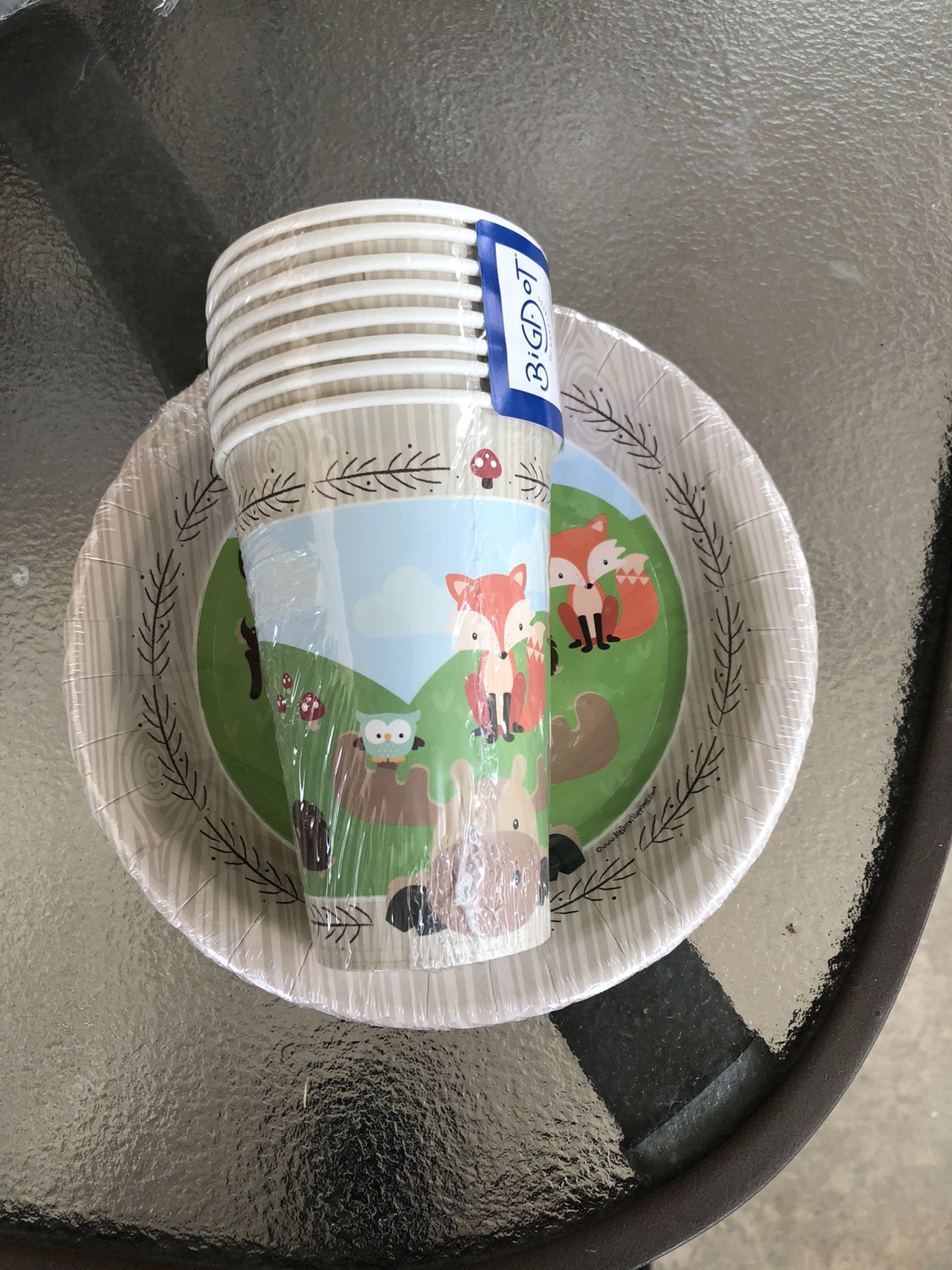 16 fox invitations 30 swirl decorations 24 dessert plates 32 12 oz cups 10 woodland cut outs-dear, fox, raccoon and moose $15 OBO