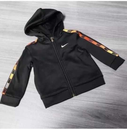 Nike Dri-Fit stylish black with vibrant orange and yellow stripes. Features a zip-up hoodie. Iconic Nike logo Great Condition, No Flaws Size 6-7 Years (L)