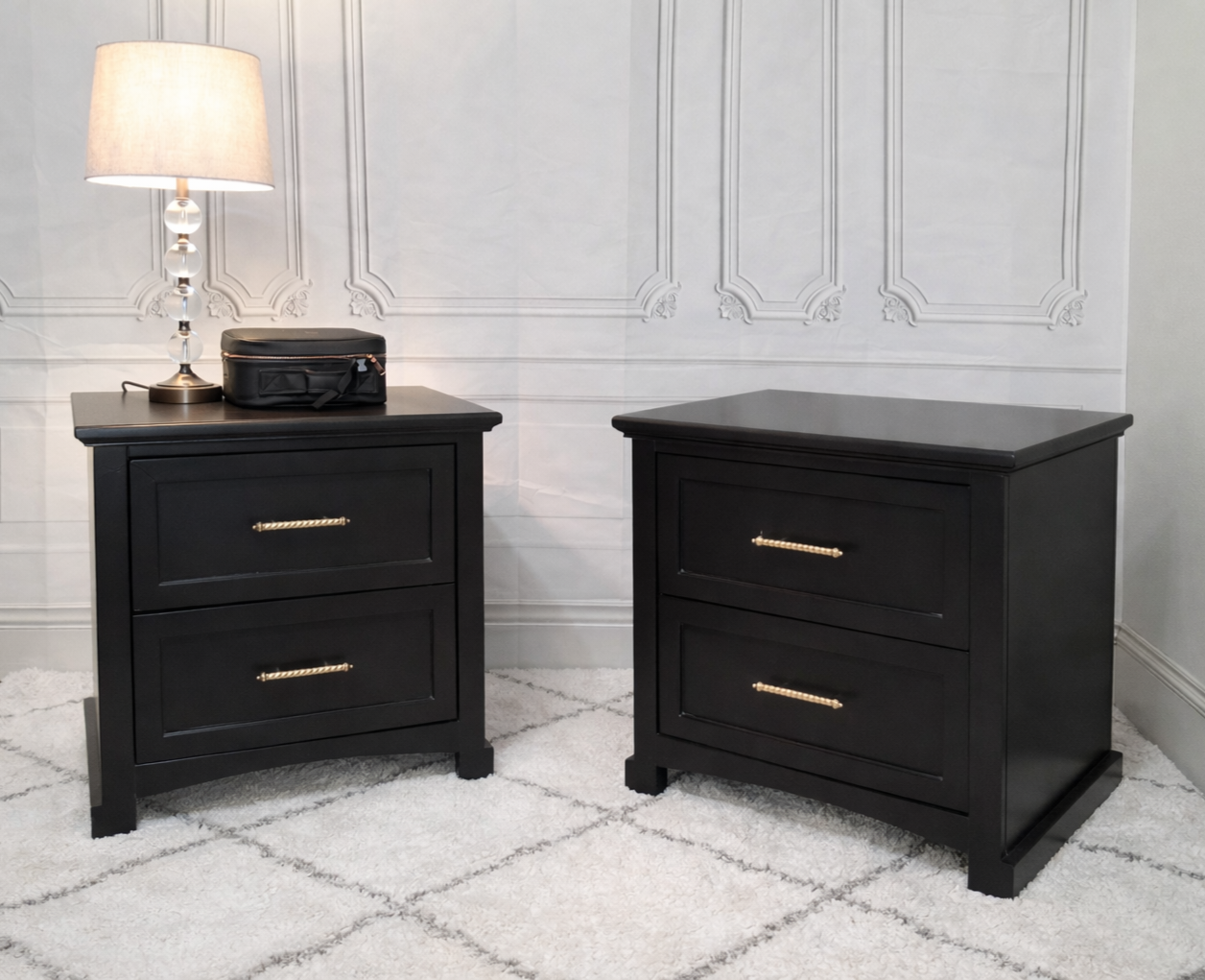 These matching nightstands have been beautifully refinished in a smooth satin black, giving them a modern, polished look that works in any bedroom. Originally used as hotel nightstands, they are built to last with a sturdy solid frame that will stand up to years of daily use. Both drawers provide generous bedside storage, and the clean, classic design pairs beautifully with contemporary, transitional, or glam décor. ✔ Satin black finish for a sleek, modern look ✔ Previously hotel-grade nightstands — durable and solid ✔ New gold hardware adds a stylish, updated touch ✔ Spacious drawers for bedside essentials ✔ Strong, well-constructed frames — built to last Perfect for your primary bedroom, guest room, apartment, or Airbnb. Price: $350 for the pair.