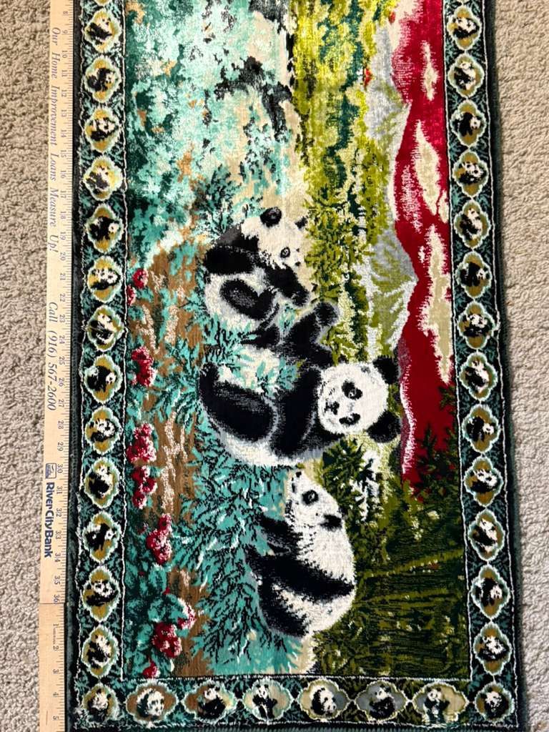 Vintage corduroy tapestry with SWAN pandas. This charming vintage tapestry, made of soft corduroy, will be a unique addition to the interior and add a touch of nostalgia. The tapestry depicts pandas. Ideal for panda lovers and collectors of vintage decor items. Main characteristics: Product type: Velvet tapestry / Wall carpet (Velveteen Tapestry). Design: Bright, detailed image of several pandas playing among dense bamboo and lush vegetation. Material: Soft, pleasant to the touch pile (velvet). Dimensions: Approximately 39 x 20 inches (99 x 51 cm), excluding decorative fringe on the edges. Condition: Excellent vintage condition, rich colors.