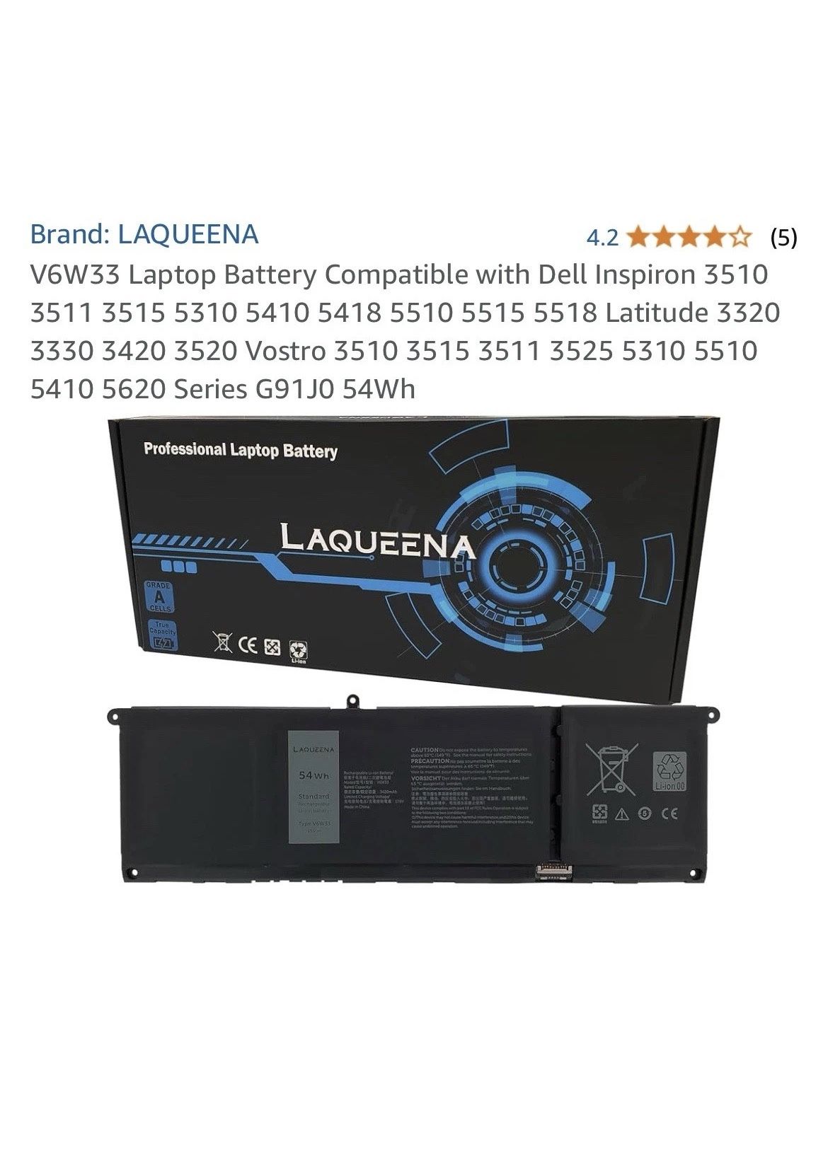 V6W33 Laptop Battery Compatible with Dell Inspiron 3(contact info removed) 3(contact info removed) 5(contact info removed) 5(contact info removed) 5518 Latitude 3(contact info removed) 3(contact info removed) Vostro 3(contact info removed) 3511 3(contact info removed) 5(contact info removed) 5620 Series G91J0 54Wh