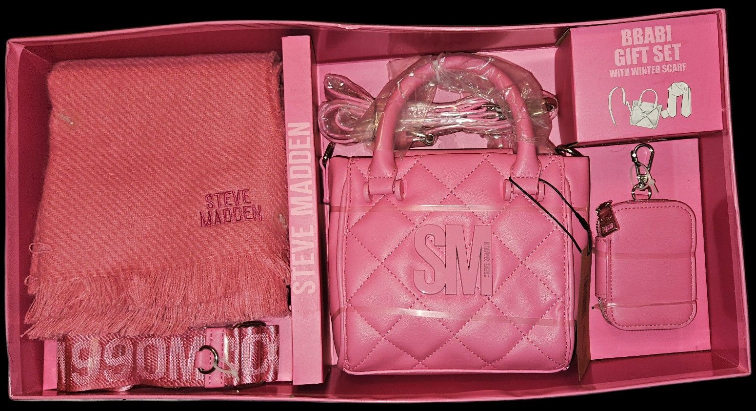 Mini Quilted STEVE MADDEN Tote bag Color: Bubble Gum PINK Includes: 2 Interchangeable Straps that adjust Keychain coin bag Winter scarf *Has zipper pocket inside