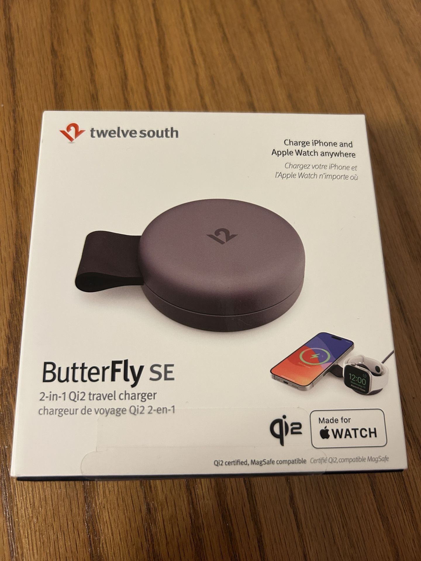 Butterfly SE 2-in-1 Compact Foldable Wireless Travel Charger, 15W MagSafe Duo Charging for iPhone, Airpods, and Apple Watch, Black Unopened and received as appeasement from Apple Store and retails for $100. Save money and tax. Comes with braided, 5ft, USB-C to USB-C cable, but needs 30W or higher USB-C adapter.