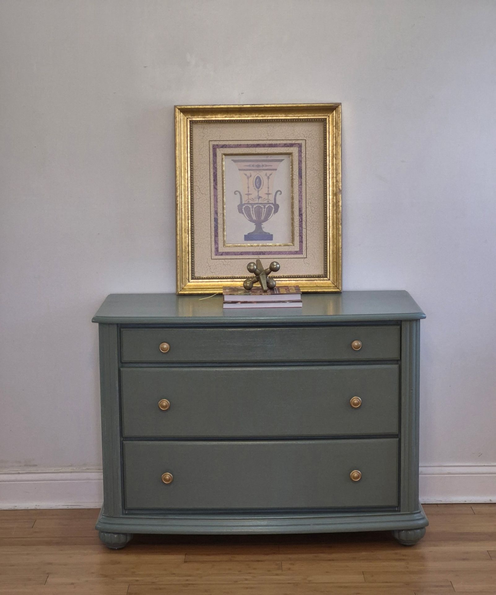 Another Saved Piece From The Landfill. Please review the before-and-after pictures. This dresser was cleaned, sanded, primed, painted, and later sealed for extra protection. Custom Sherwin-Williams was used on this piece. The dresser measures 41Wx21Dx30H.