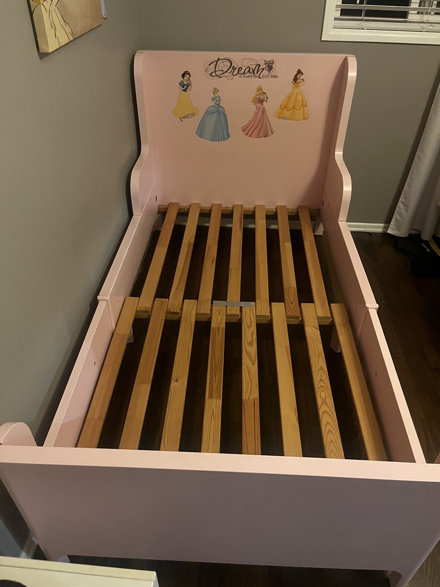 In great shape, no damage. Comes with extendable mattress for small, intermediate, and full-length twin. Plenty of storage in closet. Has rack and shelves. The Disney princess images are reusable stickers that can be removed with no damage. Bed is disassembled already and I will help load it. I’m