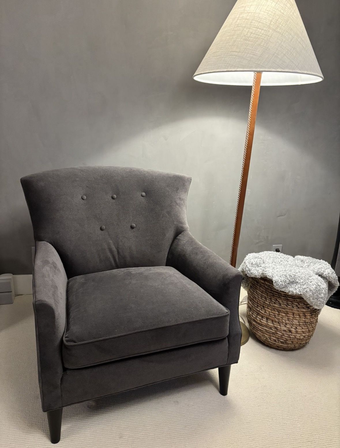 Retails for $1,270. Beautiful velvet blue/grey wing chair. Bought new and only used for 1 year. Smoke free/pet free home. Good condition, there is one loose button. Can deliver for a fee depending on location.