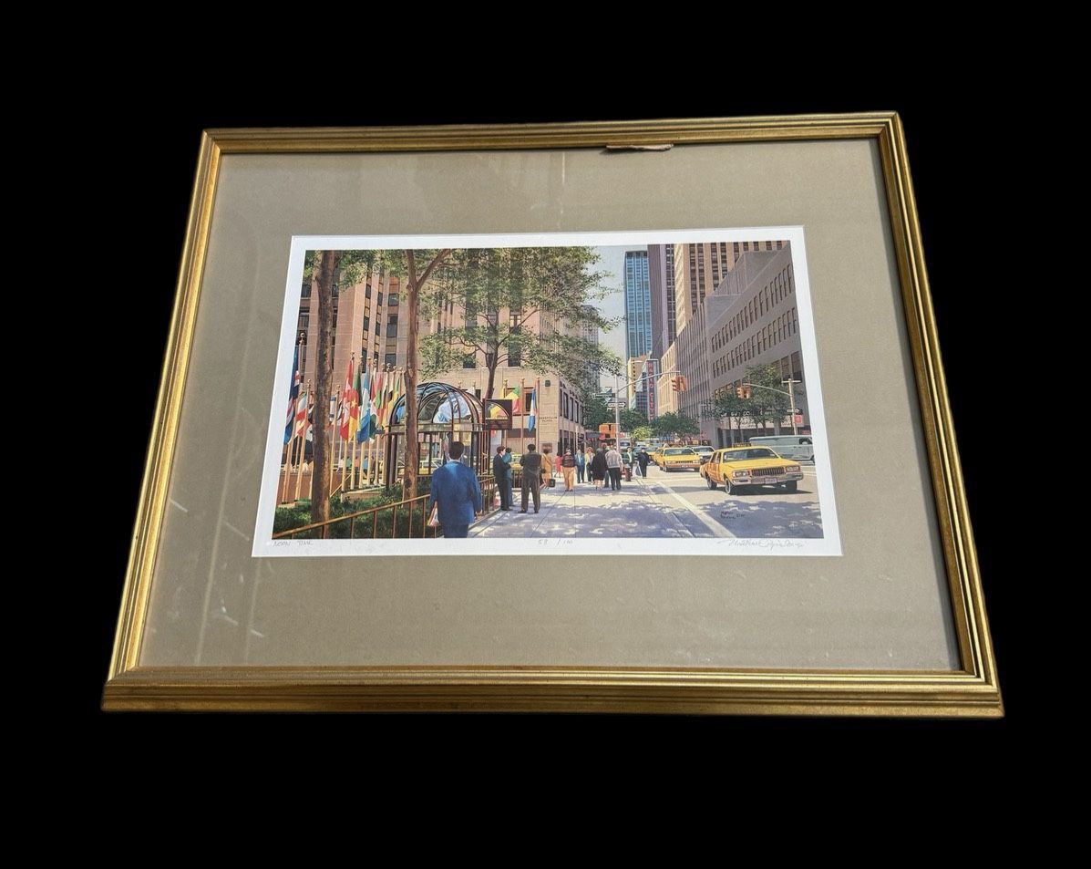 Matthew Popielarz Lithograph Signed And Numbered Noon Time 58/100 1997 Excellent condition The product is a signed and numbered lithograph print titled "Noon Time" by artist Matthew Popielarz, produced in 1997. The piece features a New York-themed subject in a pop art and illustration style. The medium-sized print is made of paper and comes matted and framed, measuring 19 inches in height and 24 inches in width. This original production technique showcases the artist's signature and limited edition numbering, adding to its collectors' value as a piece from the 1990s.