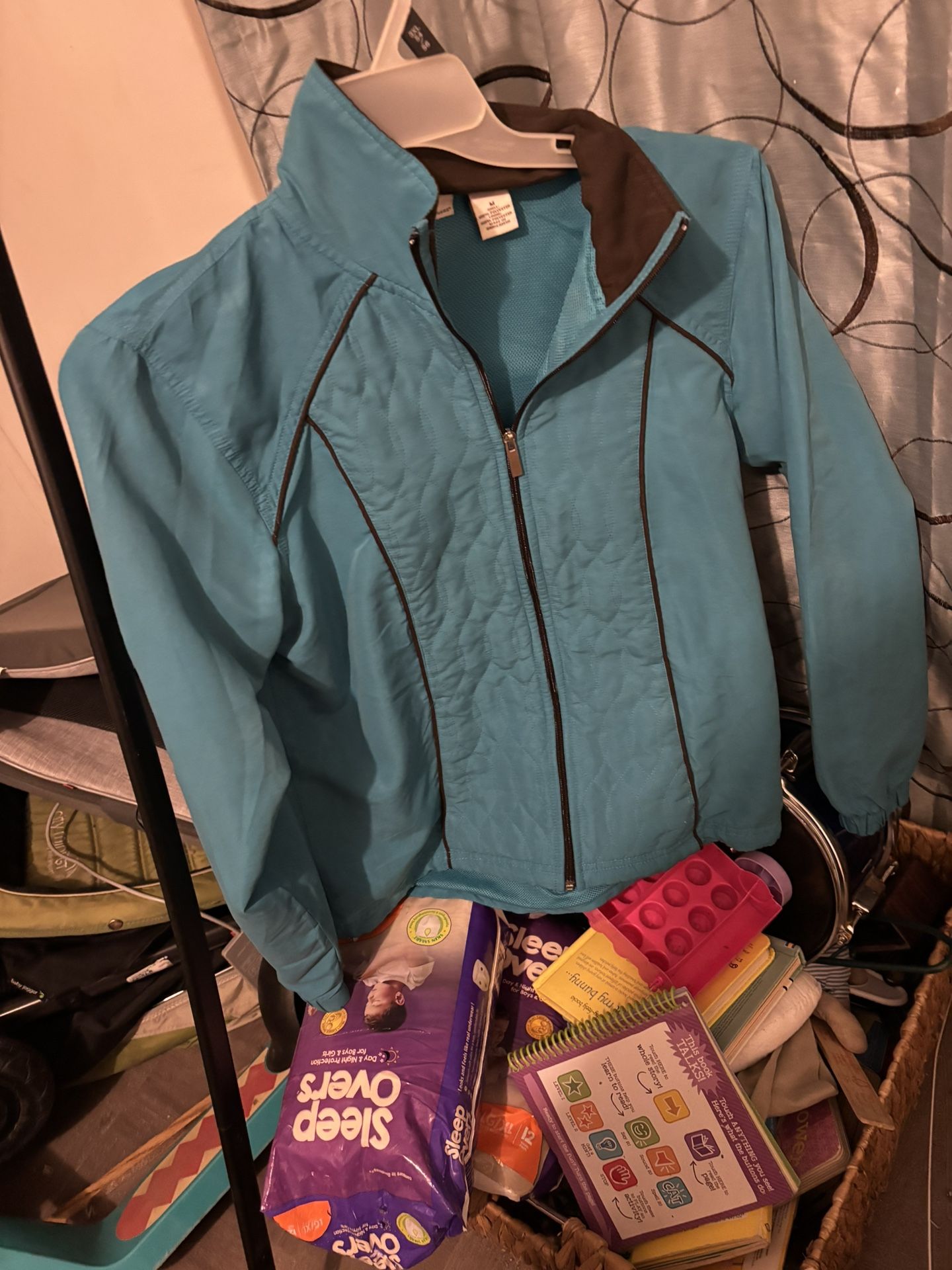 Lightweight teal zip-up jacket in gently used condition. Features a full front zipper, soft inner lining, and subtle quilted paneling for added comfort and style. Breathable and perfect for layering during cool mornings, evenings, or transitional weather. Details: • Color: Teal with black accents • Full zip front • Lightweight & comfortable • Great for casual wear, walking, or everyday use • Clean, no odors, no major flaws Perfect grab-and-go jacket for spring or fall.