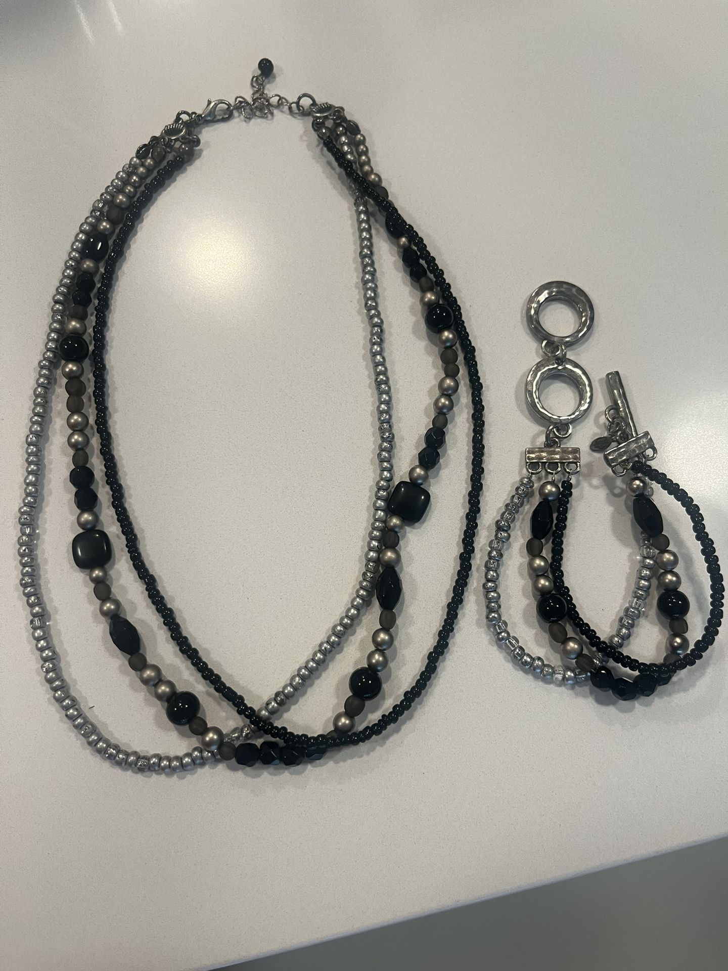 Black, silver and gray beaded necklace from Premier Design. Sold as a set only. Excellent condition. Will last for years.
