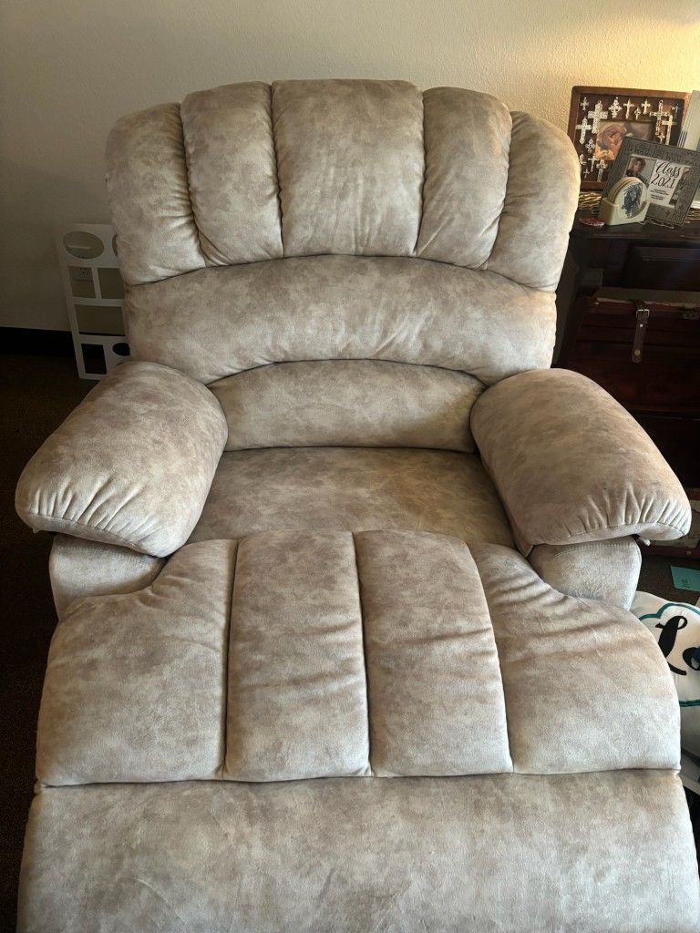 Oversized recliner with footrest and adjustable backrest, has pockets, fabric.