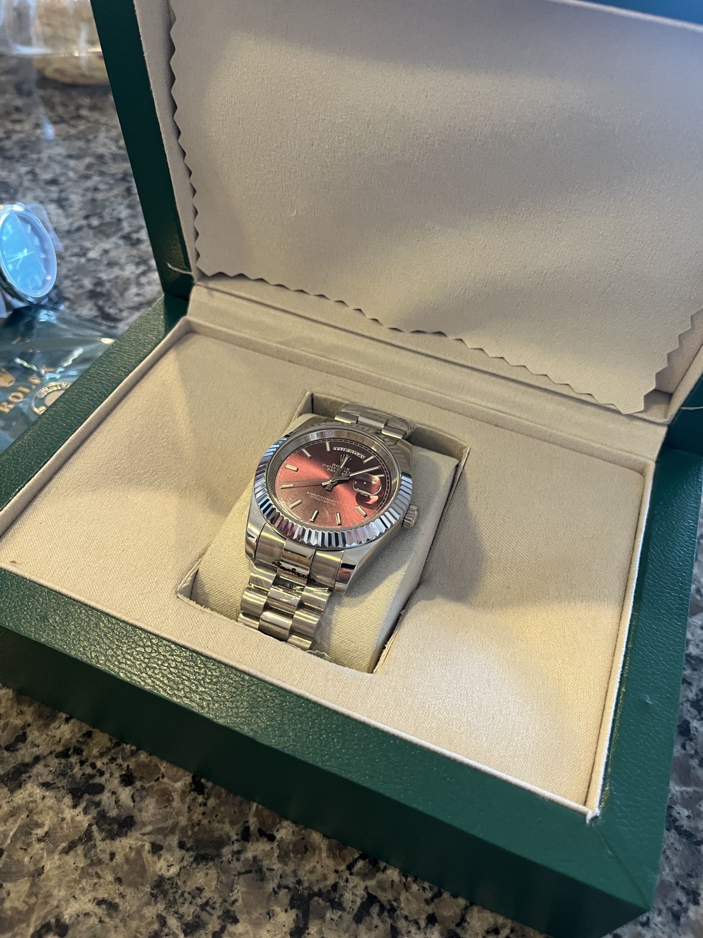 Men’s brand new luxury, Watch. Maroon dial. I have this and several more on hand right outside of Cincinnati, automatic watch. Option with or without box for additional price. Ask if you have any questions or would like to see more pictures/video.