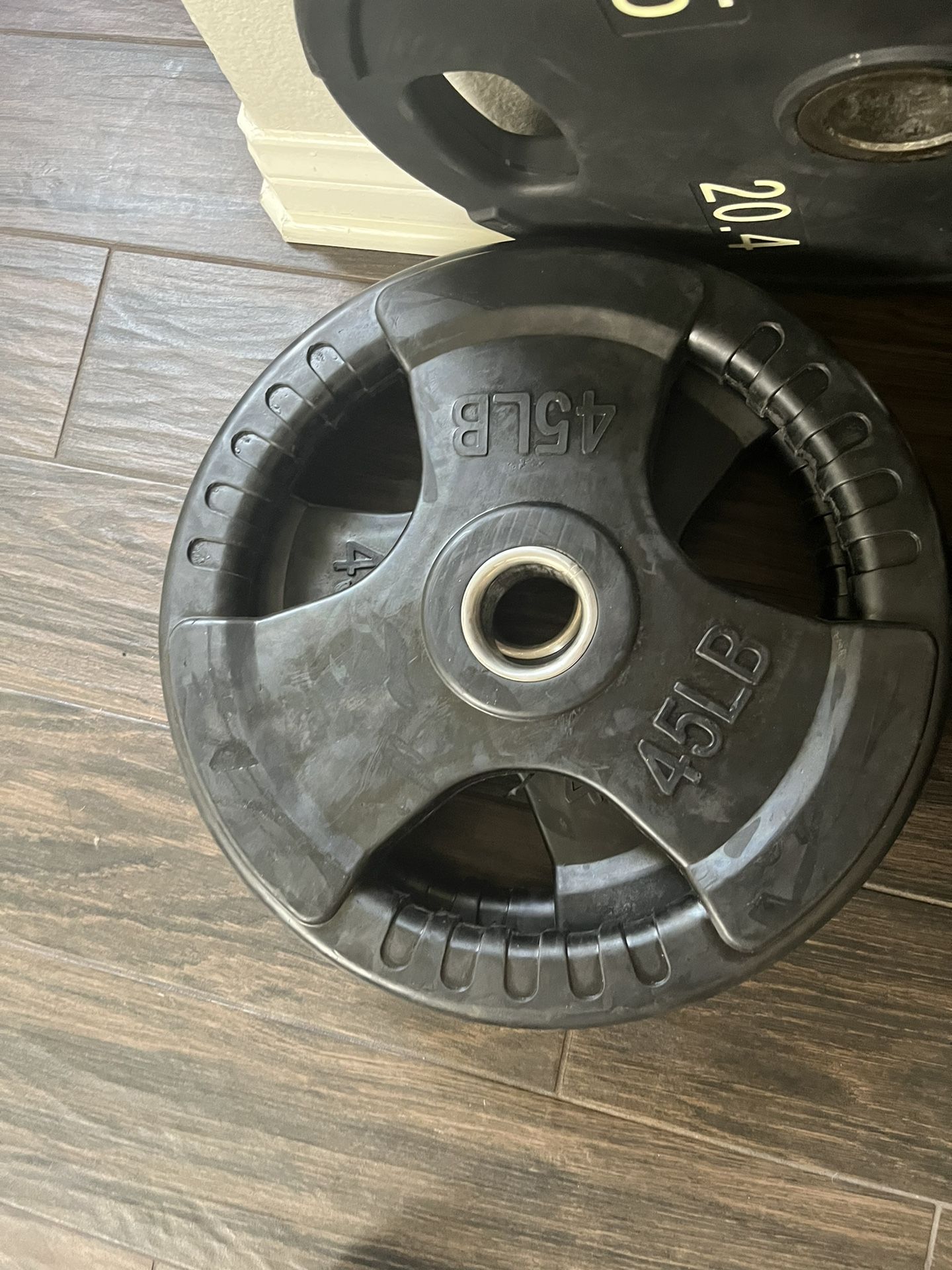 Olympic plates and Olympic bar. 1.5 per pound for the plates and 70 for the Olympic bar. Rack is already sold only selling the 35 and 45 pound sets. 45 is rubber