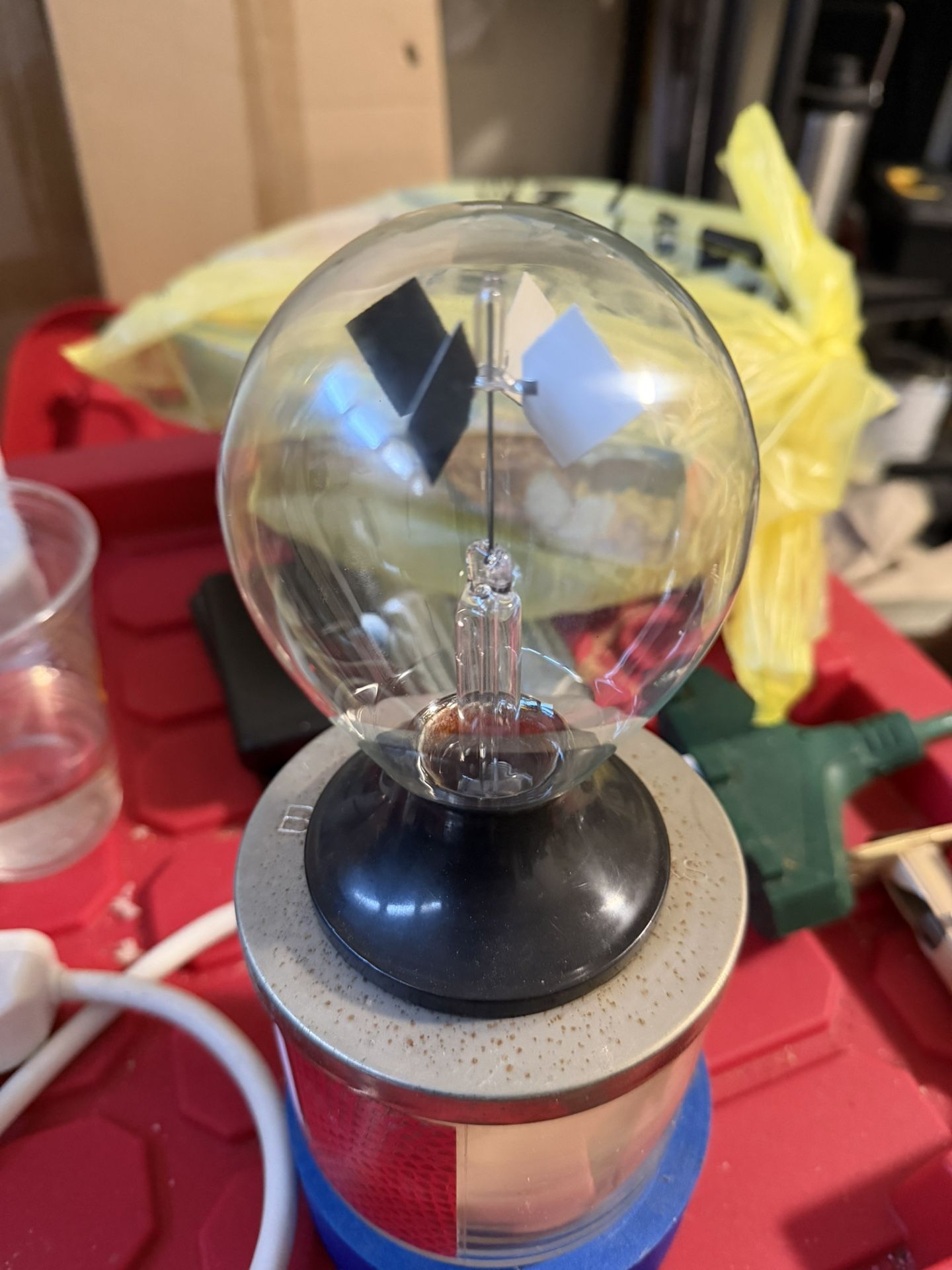 The Crookes radiometer. Black vanes absorb light, heat up, then smack into air molecules behind ’em. The other side—the silver—stays cooler, so the molecules bounce back slower. Net push, vanes spin. Works best in low pressure. Cool little toy.
