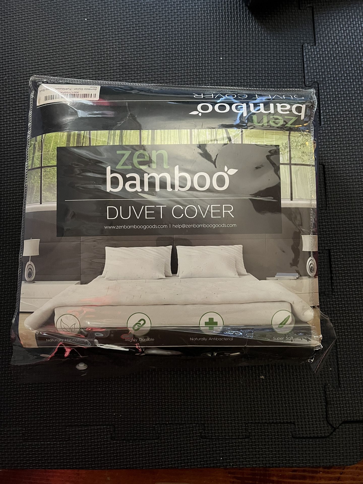Brand new- never used Zen Bamboo Duvet Cover Full/Queen Navy Blue 1 x Duvet Cover (90” x 90”) with zipper closure 2 x Standard Pillow Shams (26” x 20”) Naturally Hypoallergenic & antibacterial
