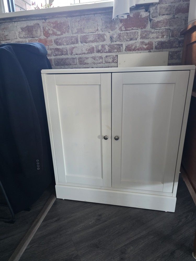 Simple white, two-shelf cabinet. 18" deep x 32" length x 35" height. Very good condition, IKEA brand, not too heavy, very good condition