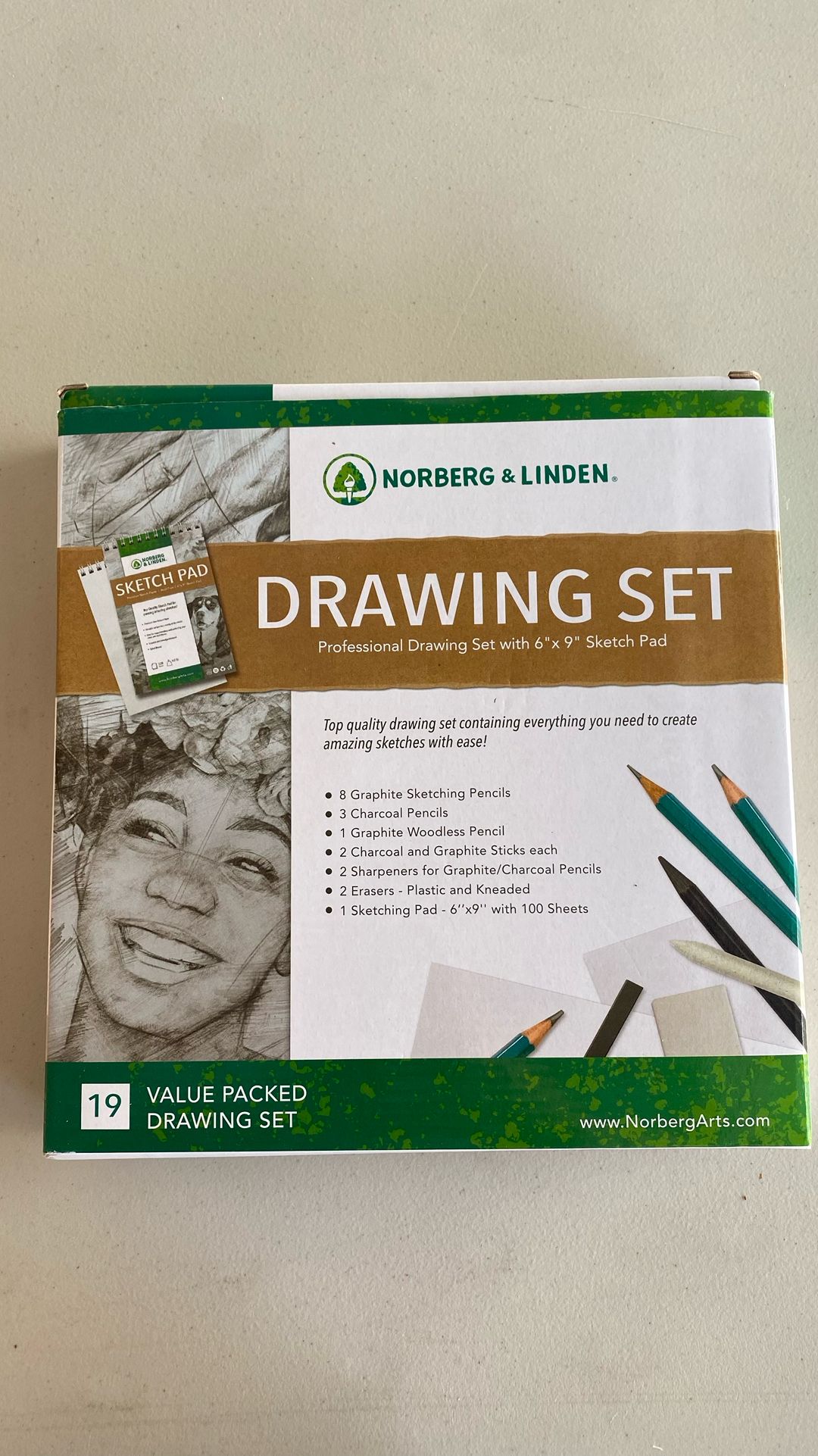 Never used drawing set with charcoal, graphite & charcoal pencils, sharpeners, erasers and a 100 page 6” x 9” sketch pad.