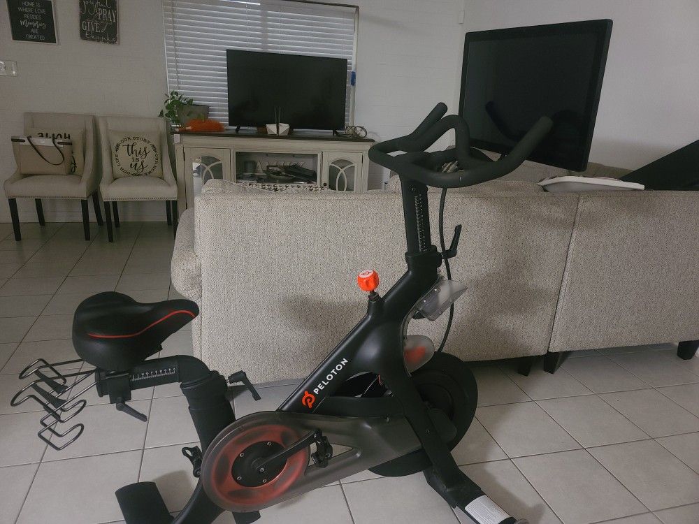 Peloton professional exercise bike is in excellent condition with tennis shoes included