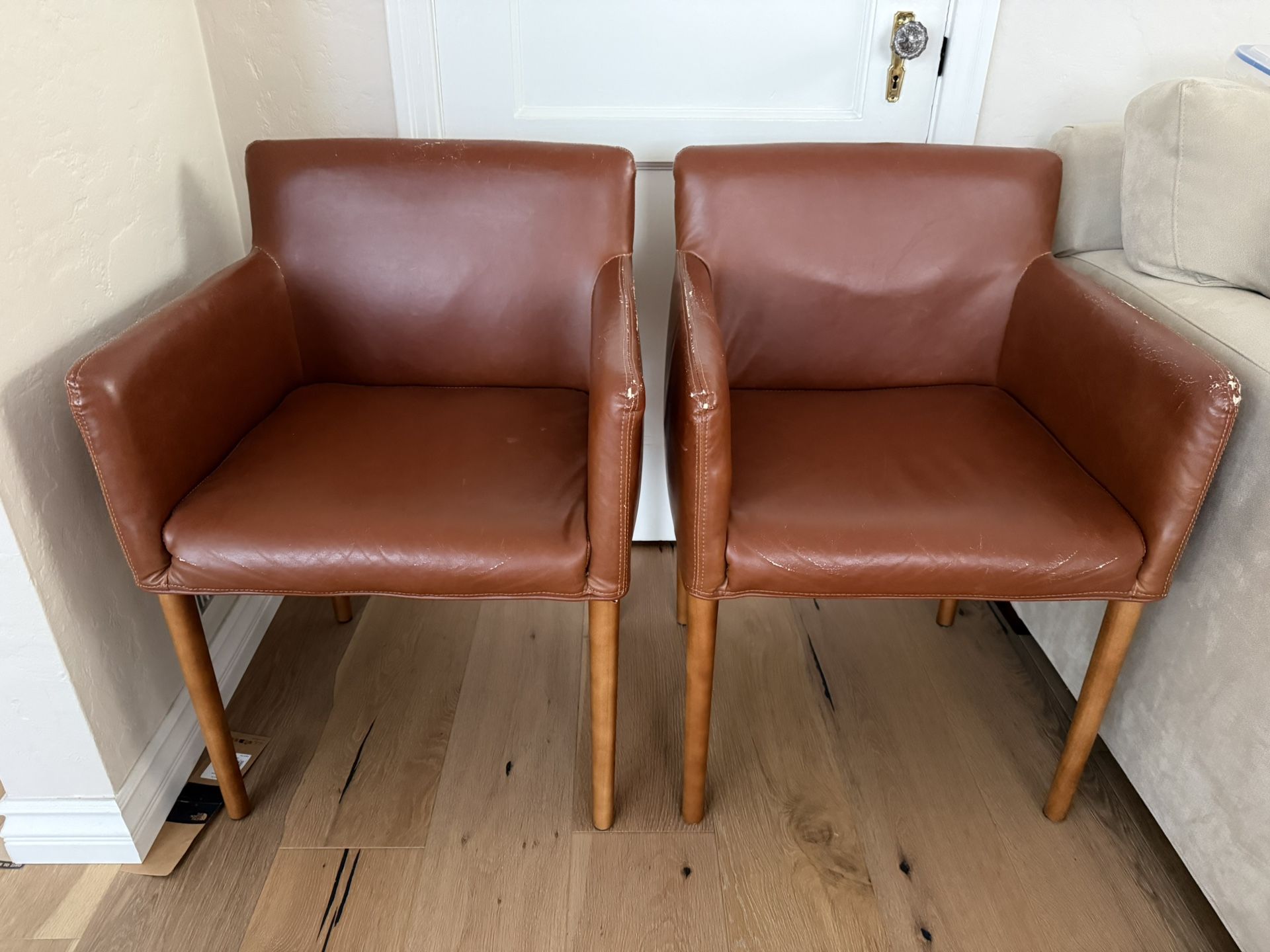 Used in Fair condition West Elm Ellis Dining Chairs in Cognac color Chairs construction and wood legs are in good shape. The only issues are with the chair covers, and the reason for the “fair” condition. They are synthetic leather and have started to crack and chip off in places. Refer to photos for condition I’m the original owner Buyer must purchase both chairs, pricing is for both. Local pickup/meet in Pasadena