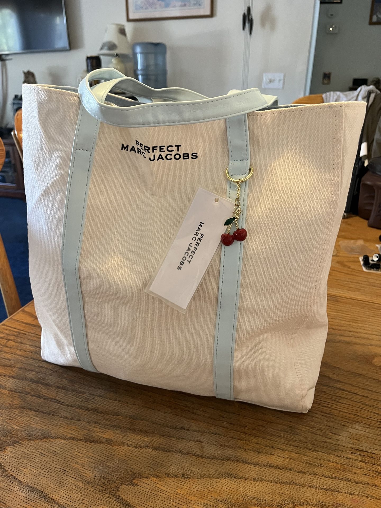 High desert newer Adelanto pick up- Mark Jacob’s Perfect Large Dual Handle Tote Bag Ivory White Canvas & Blue Smooth Trim leather style. Think used 1 time in very clean excellent condition inside & out. Baby blue color inside lining, $30. No pockets inside, it’s like decent size beach bag.