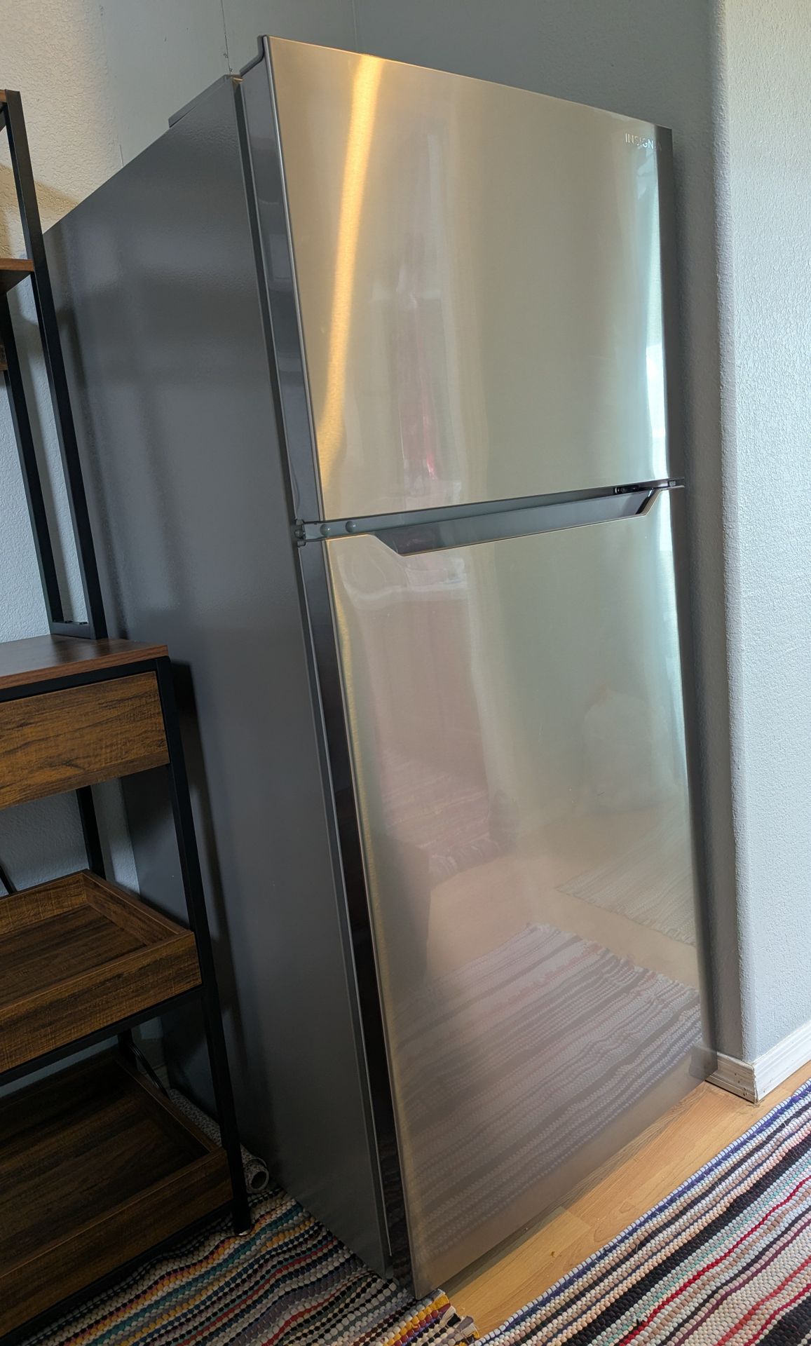 Like new, only used for 7 weeks, pristine condition, perfectly clean, functional, and ideal for personal use. Significant discount from original price!!! Pick Up Only - needs 2 people to move and a truck to load. Can lend dolly for transport out of my place. Please see full details below: Dimensions: 60.5"Hx27.5"Lx28.5"W "14.2 cu. ft. capacity Provides enough space for all your essentials and much more. Versatile placement A freestanding design with reversible doors provides flexible placement options. Separate top freezer Separate freezer compartment with a removable shelf and two door trays stores frozen snacks, entrees and more. Optimal fridge storage Three glass shelves (one fixed and two adjustable), one full-width crisper drawer and two door trays in the refrigerator compartment help organize your items and keep your foods fresh. LED interior lighting Illuminates the food in your refrigerator, making it easy to see the contents. Easy temperature control Adjust the temperature of your fridge from 34° to 50° F (1° to 10° C) or the temperature of your freezer from -11° to 10° F (-24° to -12° C). Frost-free design Provides outstanding frost maintenance with no need for manual defrosting. Recessed handles Creates a low-profile and understated look. Fingerprint resistant An added fingerprint-resistant coating grants easy cleaning that stays looking clean. Ice-maker ready Accessorize your fridge with an optional automatic ice maker in the freezer compartment. Stainless steel design Looks great in any kitchen, matching the rest of your appliances. Brought to you by Best Buy Insignia brings you affordable, dependable products with all the features you need."
