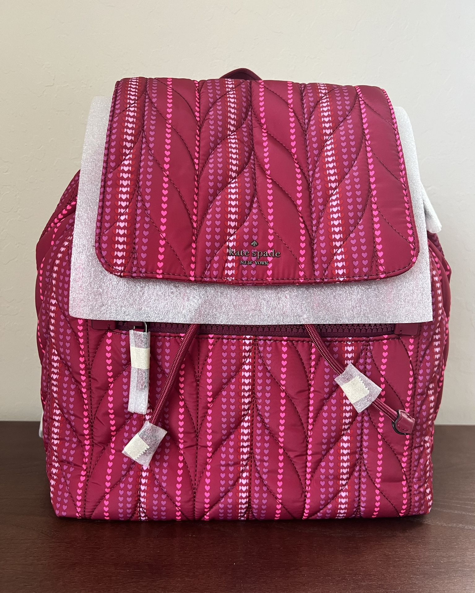 Super cute for Valentine’s Day! Kate Spade Ellie backpack with heart print. New with tags. Color: Cranberry cocktail multi. Comes from smoke-free household.