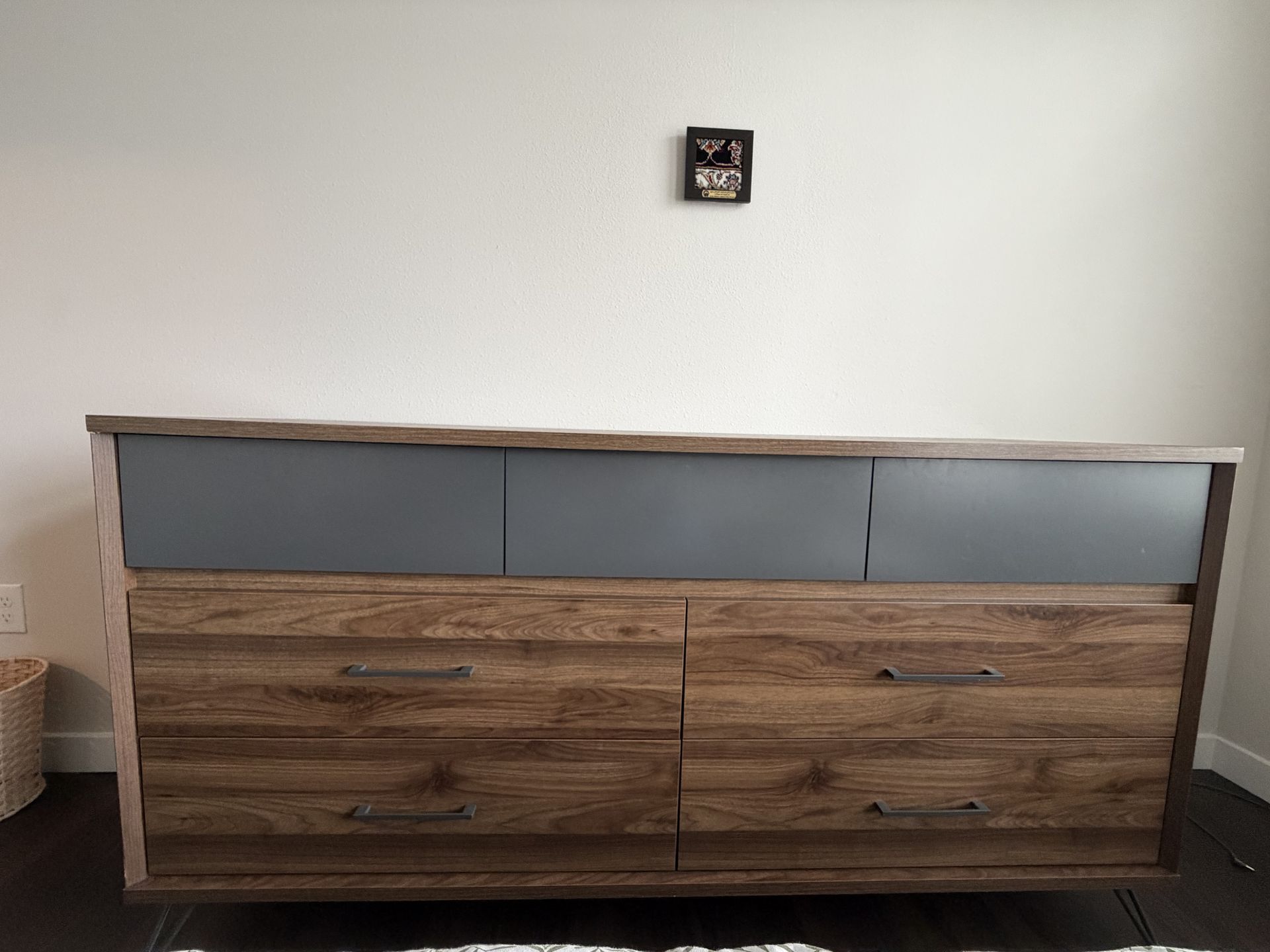 Selling a modern 7-drawer dresser from South Shore Furniture with a beautiful walnut finish and gray accent panel. The design has a clean mid-century modern style with sleek metal legs and handles. The dresser is in excellent condition and has been well taken care of. Features: • 7 spacious drawers • Walnut wood finish with gray accent panel • Modern metal legs and handles • Sturdy and stylish design • Great storage for bedroom organization Also selling the matching nightstands from the same collection (see my other listing). Perfect if you’re looking for a full matching bedroom set. Pickup only.