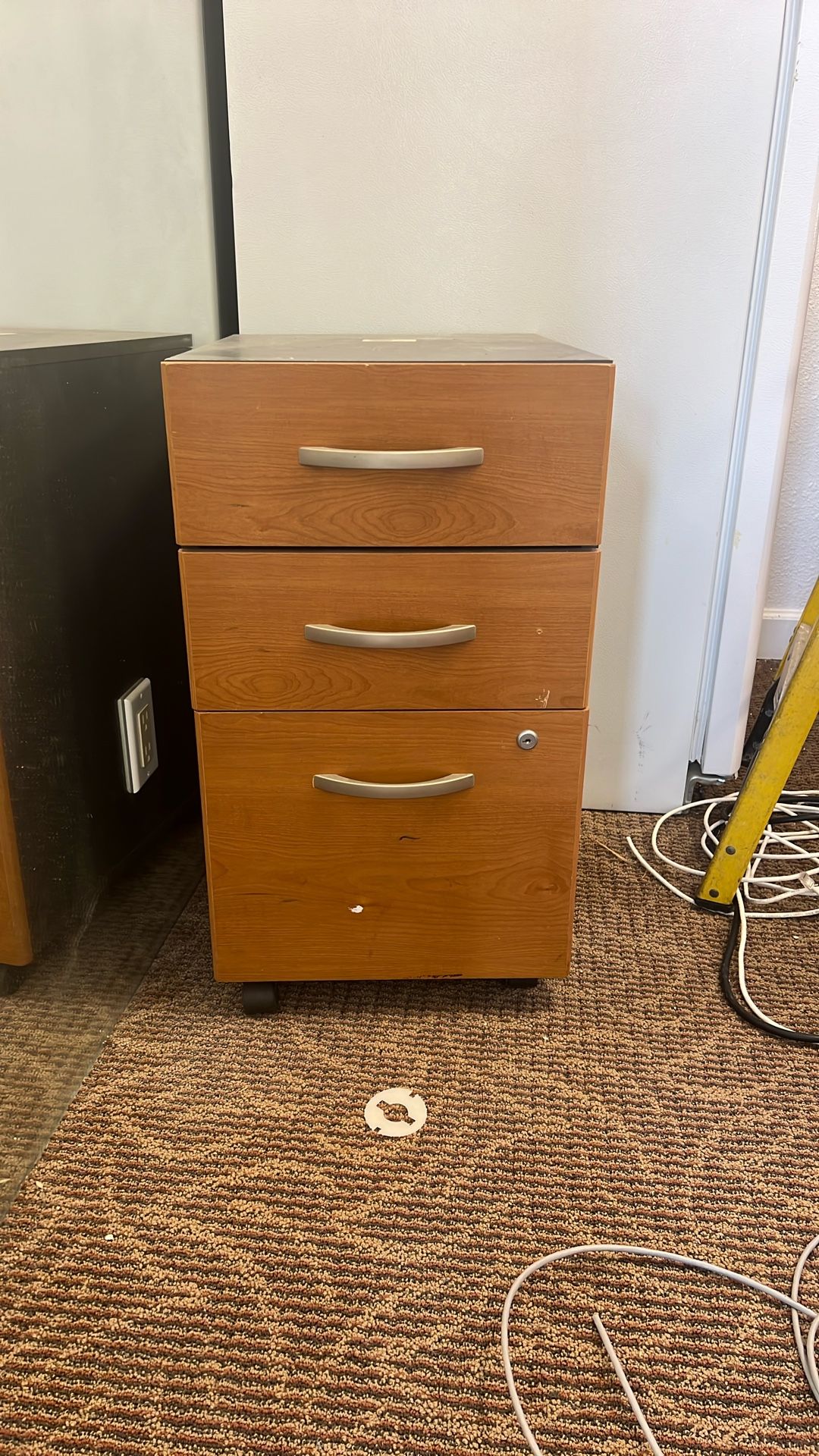 Filing cabinet with wheels. Buyer needs to pick up. Not heavy. Dimensions: 16in L x 20 1/2in D x 28in H